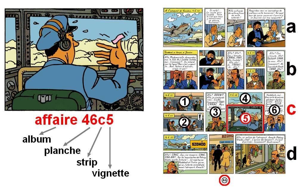Selon la classification "Sabourin", utilisée ici, la référence de chaque vignette d'un album Tintin s'énonce par :