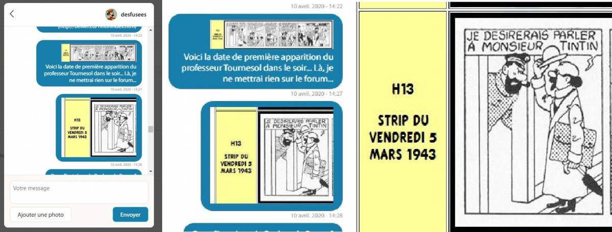 huboff62 - Bravo pour nicnol qui a trouvé : Tournesol "naît", dans "Le trésor de Rackham le Rouge", le 05 mars 1943 (strip h 13 du "Soir") ... Sa réponse est du : 10/04/2020 à 17:35, répondu après 3 heures par rapport à ma réponse... Je suis content pour nicnol qui a trouvé, mais moi qui a répondu juste, je n'ai rien eu... J'ai découvert que notre jeune ami desfusees ne lit pas toujours sa messagerie... Il vous félicite d'avoir trouver mais je n'ai pas eu cet honneur... ce n'est pas de la jalousie car je n'attend pas après ça... ! Lol ! La prochaine fois, je répondrait sur le forum... De plus, je croyais qu'il fallait répondre que dans la messagerie. Ce qui est étonnant c'est qu'on parle aussi de la même recherche que j'ai réalisé, car moi aussi [j'ai fait des recherches]... Coïncidence ou hasard... ? nicnol et moi-même, on a répondu exactement pareil. desfusees ne pourra pas dire le contraire si il regarde sa messagerie. Au moins, même si il ne le disait pas ouvertement sur son Quizz, papyalbert lisait sa messagerie car il me donner une suite à ma bonne ou mauvaise réponse. C'était correct de sa part.