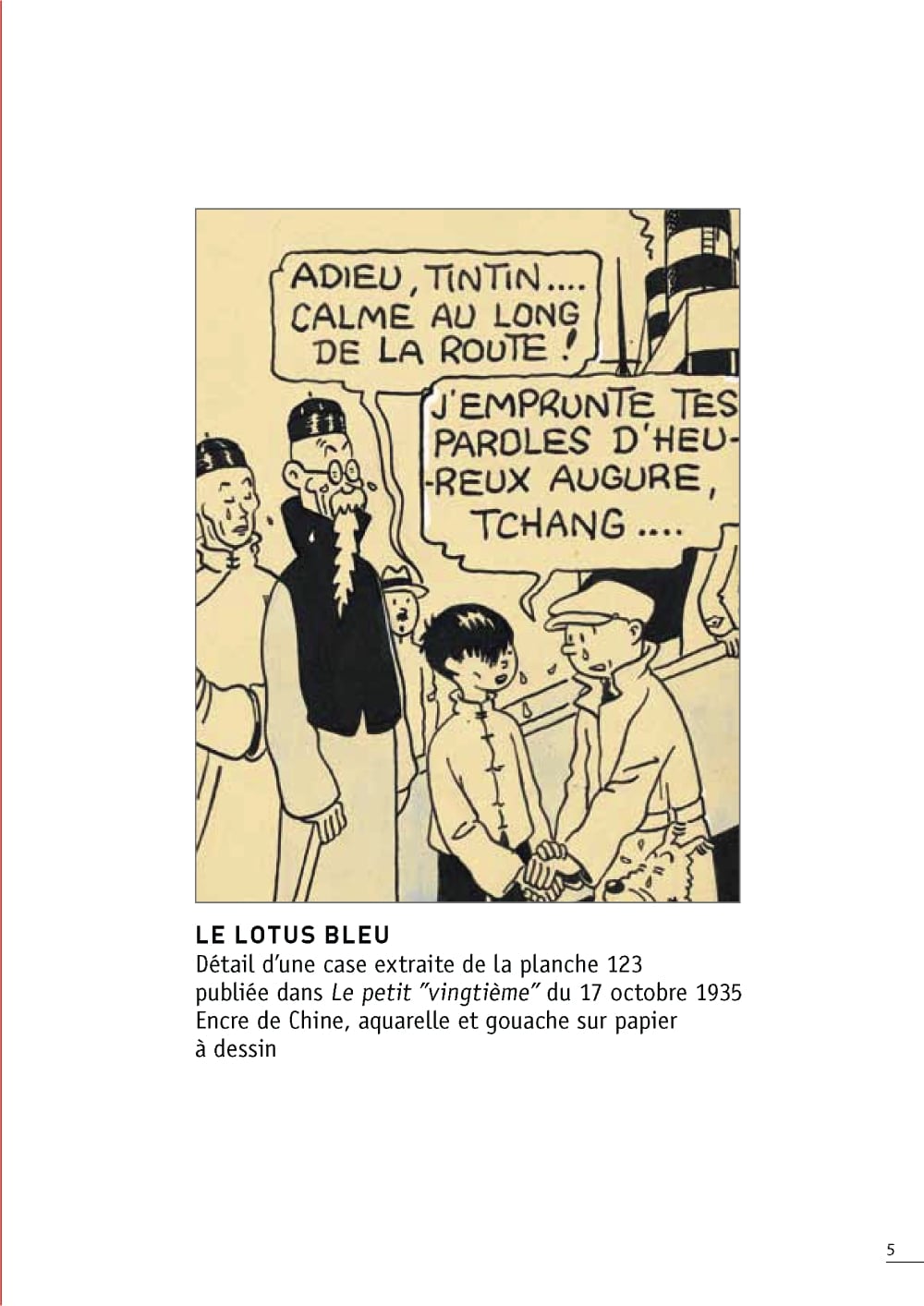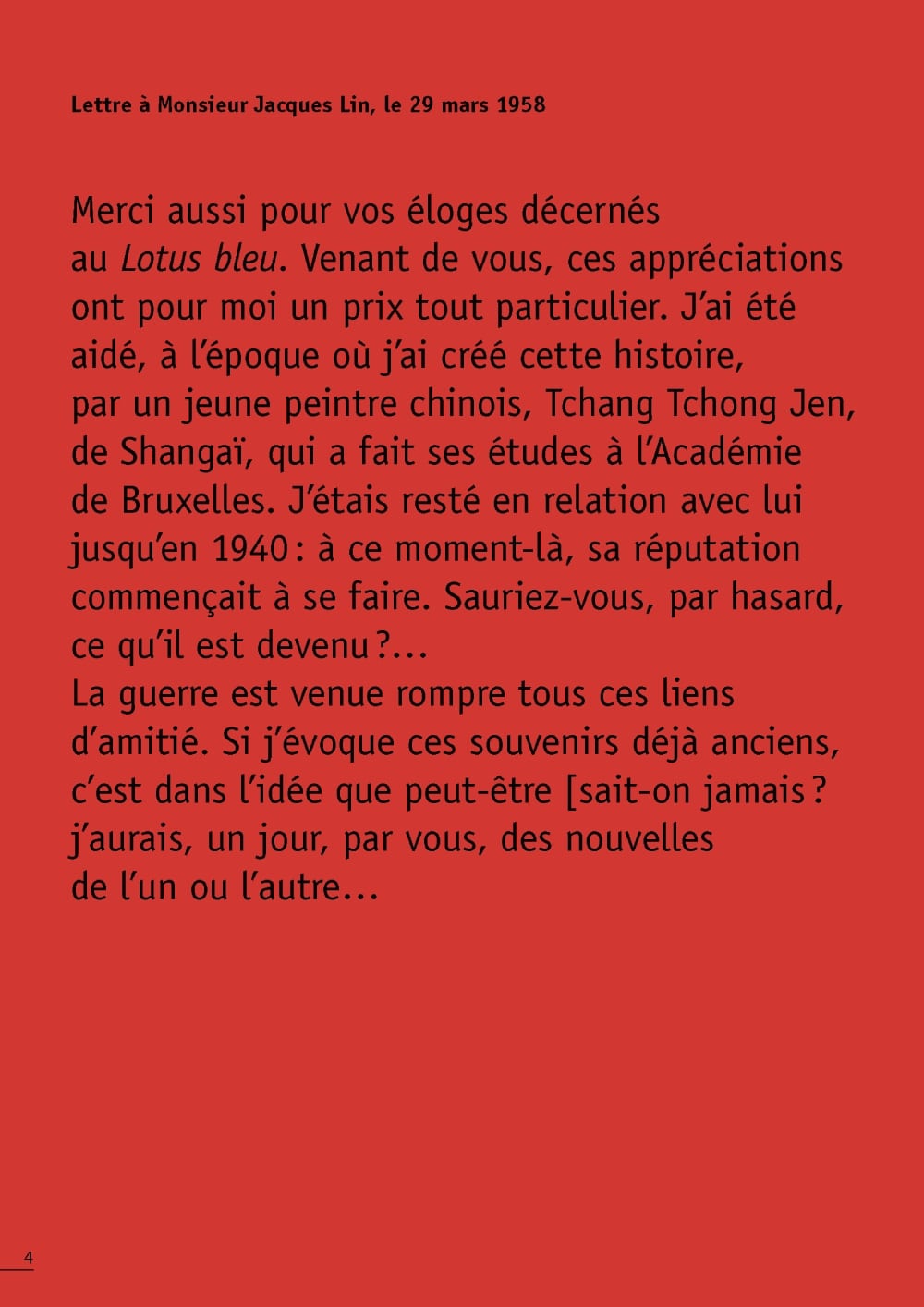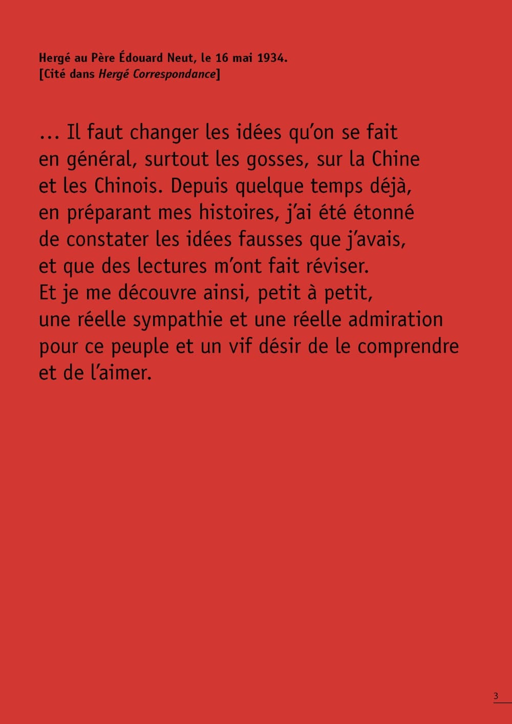 Hergé au père Edouard Neut, le 16 mai 1934 : "... il faut changer les idées qu'on se fait, surtout les gosses,sur la Chine et les Chinois. Depuis quelque temps déjà, en préparant mes histoires, j'ai été étonné de constater les idées fausses que j'avais, et que des lectures m'ont fait réviser. Et je me découvre ainsi, petit à petit, une réelle sympathie et une réelle admiration pour ce peuple et un vif désir de la comprendre et de l'aimer."