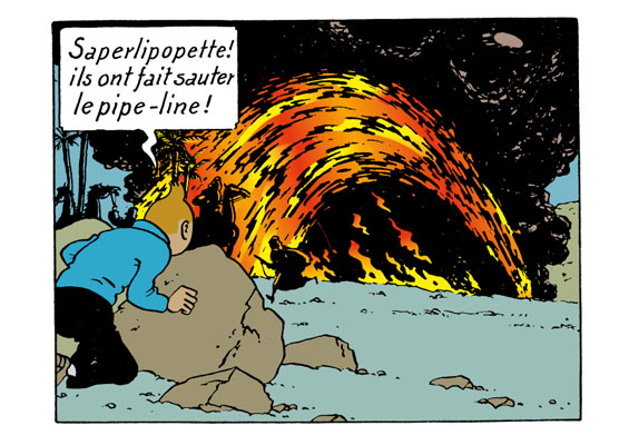 Les aventures de Tintin suivent l'évolution de l'importance du pétrole dans la vie de tous les jours, au 20ème siècle. Visiteur des Etats-Unis, Tintin assiste à la dépossession des terres indiennes par les compagnies pétrolières. A cette occasion, il sera même arrosé de pétrole, surgissant d'un puits qu'il a involontairement visité ! A cette époque (années 1930), l'automobile et l'aviation prennent leur essor. Mais la fin des années 1940 et les années 1950 verront se répandre l'ère du plastique - issu du pétrole. C'est dans ce contexte qu'il faut replacer Tintin au pays de l'or noir, et les sabotages de pipelines par le sinistre Müller. A ce moment-là, les pipelines, transportant le pétrole, depuis le Moyen-Orient ou la Russie étaient bien en place et différentes opérations de sabotage avaient ému la presse internationale. Mais qui aurait pu imaginer que le pétrole, qui contribua aux progrès du bien-être humain, pouvait devenir notre pire ennemi ?