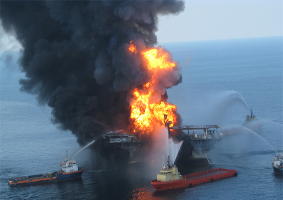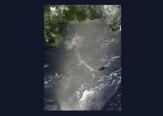Le 20 avril 2010 une explosion se produit sur la plate forme pétrolière Deepwater Horizon, exploitée par la British Petroleum (BP), à 70 km des côtes de la Louisiane et de ses réserves naturelles. Au début, et en raison des mensonges et contre-informations successives de BP, on estimait à 2 à 3 millions de litres (1.800 à 2.600 tonnes) la quantité de pétrole brut déversé chaque jour en mer. Les scientifiques et les écologistes disposent d'instruments de mesure pour évaluer l'importance d'une pollution. Et, malheureusement, d'une expérience qui s'enrichit d'année en année... La photographie aérienne indique la superficie touchée par la pollution. Ensuite, on évalue l'aspect de la mer dans cette superficie : des reflets argentés indiquent une pollution mineure (32 tonnes sur un hectare), tandis qu'une couleur sombre est le signe d'une pollution très grave (1700 tonnes à l'hectare). Dans le Golfe du Mexique, la couleur est très sombre...