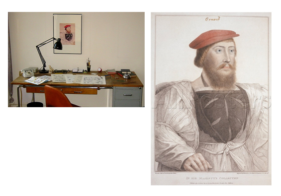 Durant plusieurs années, un portrait de Holbein, suspendu au mur, trônait au-dessus de sa table à dessin. Holbein bénéficiait d'une situation privilégiée dans l'antre du maître de la BD. Hergé n'avait qu'à lever la tête pour admirer le portrait de Sir Thomas Boleyn dessiné par Hans Holbein Le Jeune. Une source d'inspiration pour le trait si cher à Hergé.