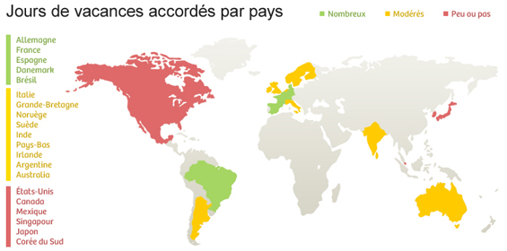 Malgré ce recul, les Européens demeurent les champions du monde des vacances. Qu'ils restent ou qu'ils partent, la moyenne européenne est de 25 à 30 jours de congés chaque année (alors que le reste du monde (Asie - Amérique du Nord) est plutôt sur une moyenne de 5 à 15 jours. L'Amérique du Sud est entre les deux. Les Français sont parmi les plus chanceux avec plus de 30 jours de congés par an.
