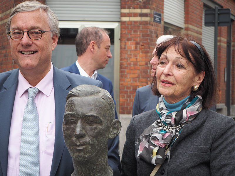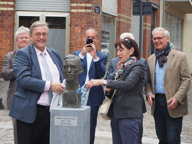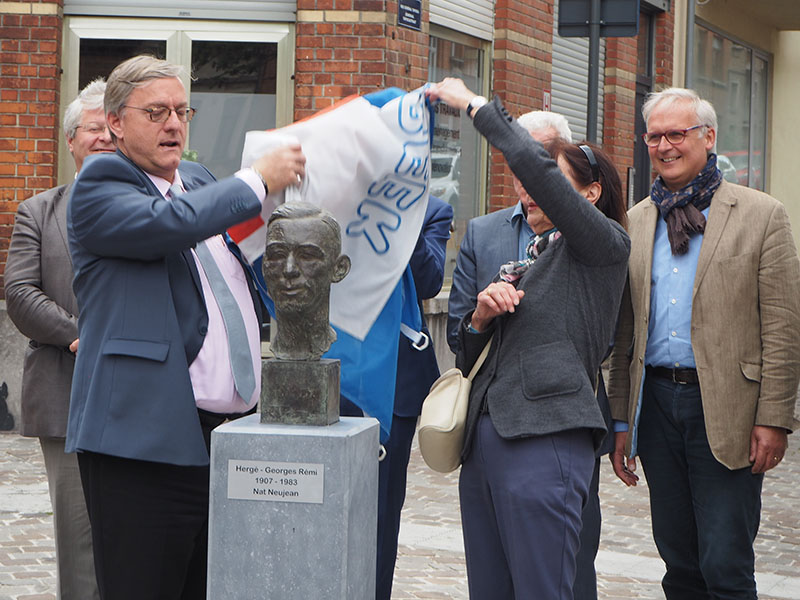 La nouvelle place Hergé se pare d’un buste d’Hergé en bronze réalisé par le sculpteur Nat Neujean en 1958.