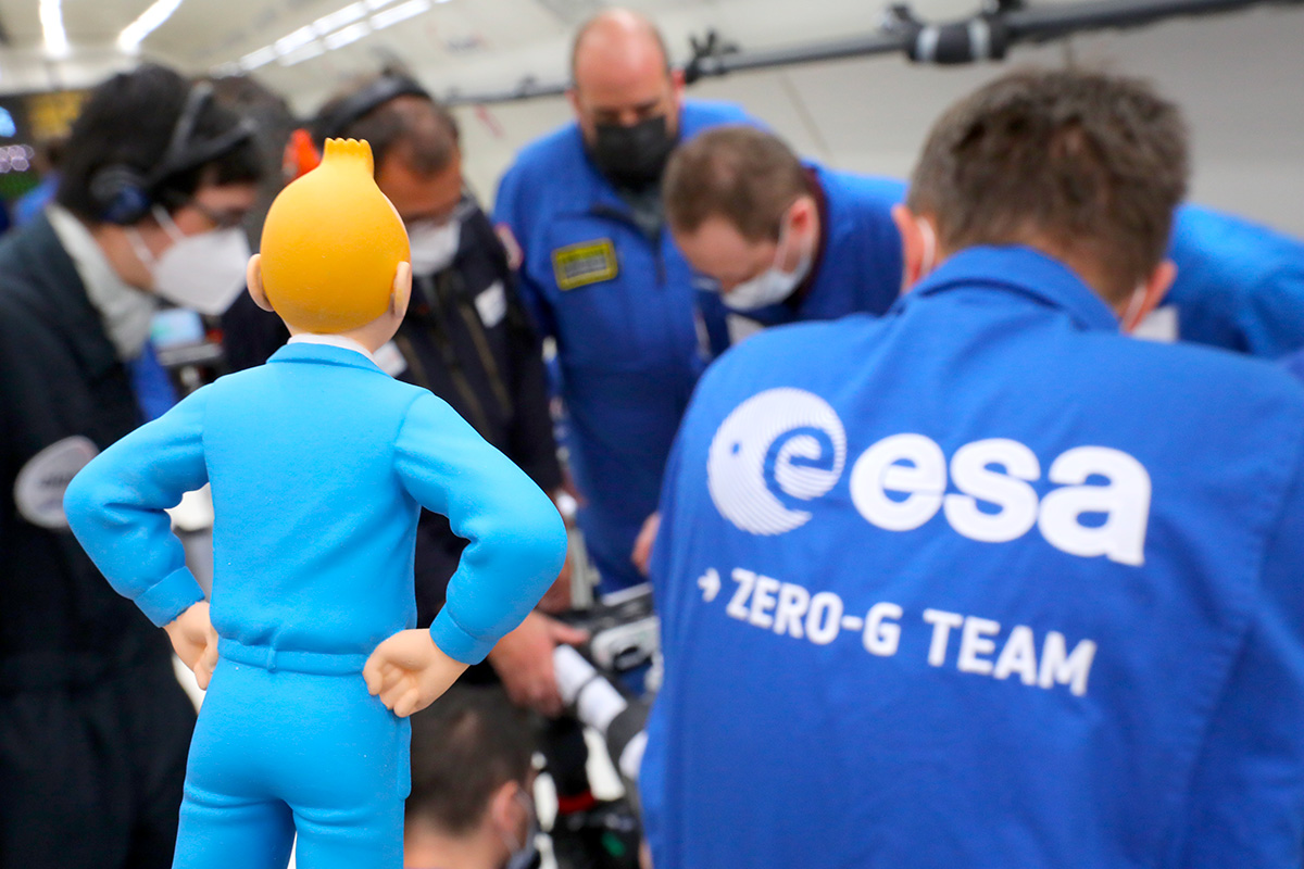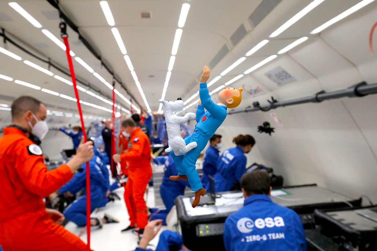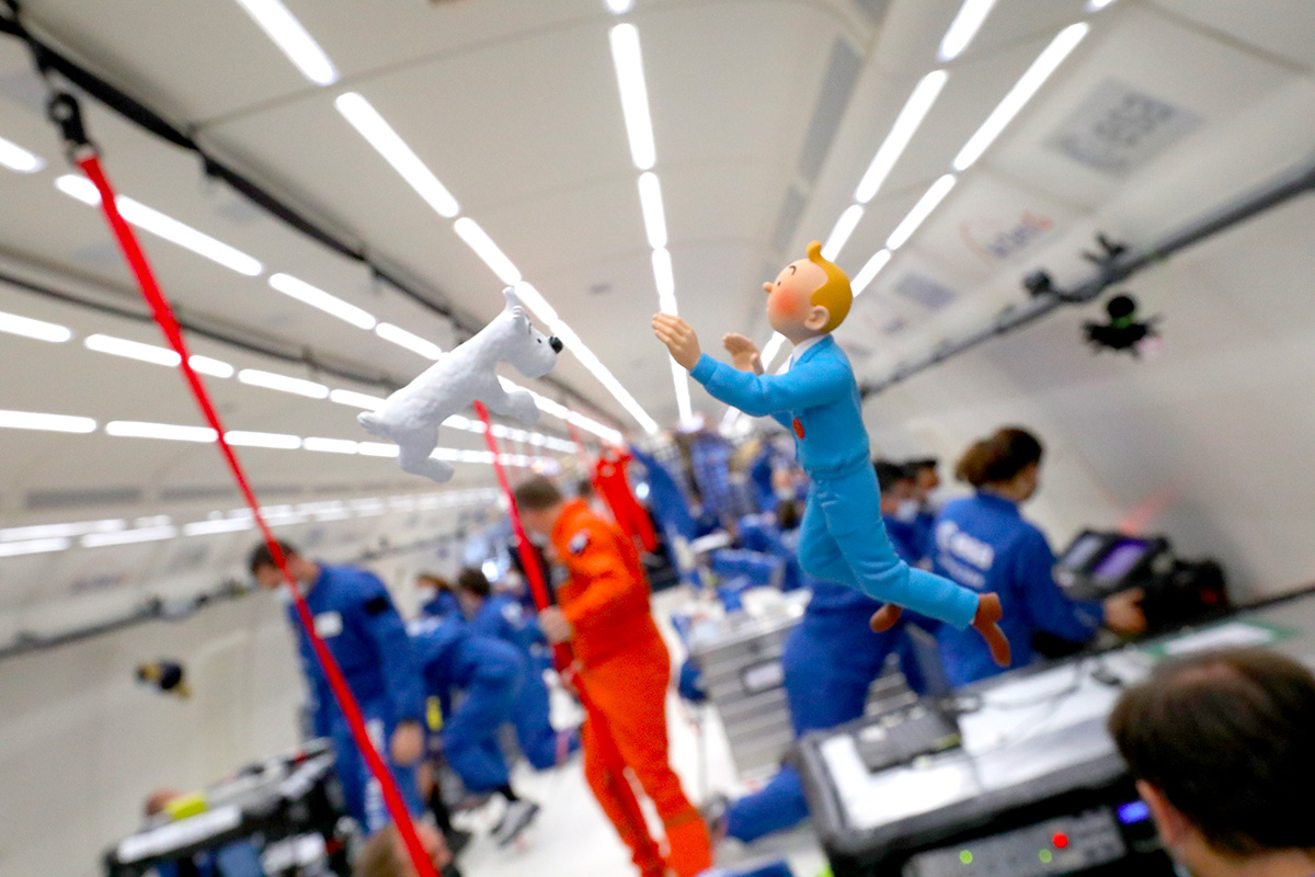 L’équipe de l'ESA (l’Agence spatiale européenne) a inauguré sa collaboration avec Moulinsart par un vol parabolique avec des invités de qualité : notre jeune reporter, Tintin et son fidèle compagnon, Milou. Les deux acolytes ont expérimenté les incroyables sensations de l'apesanteur pendant quelques minutes à plus de 26 246 pieds!
