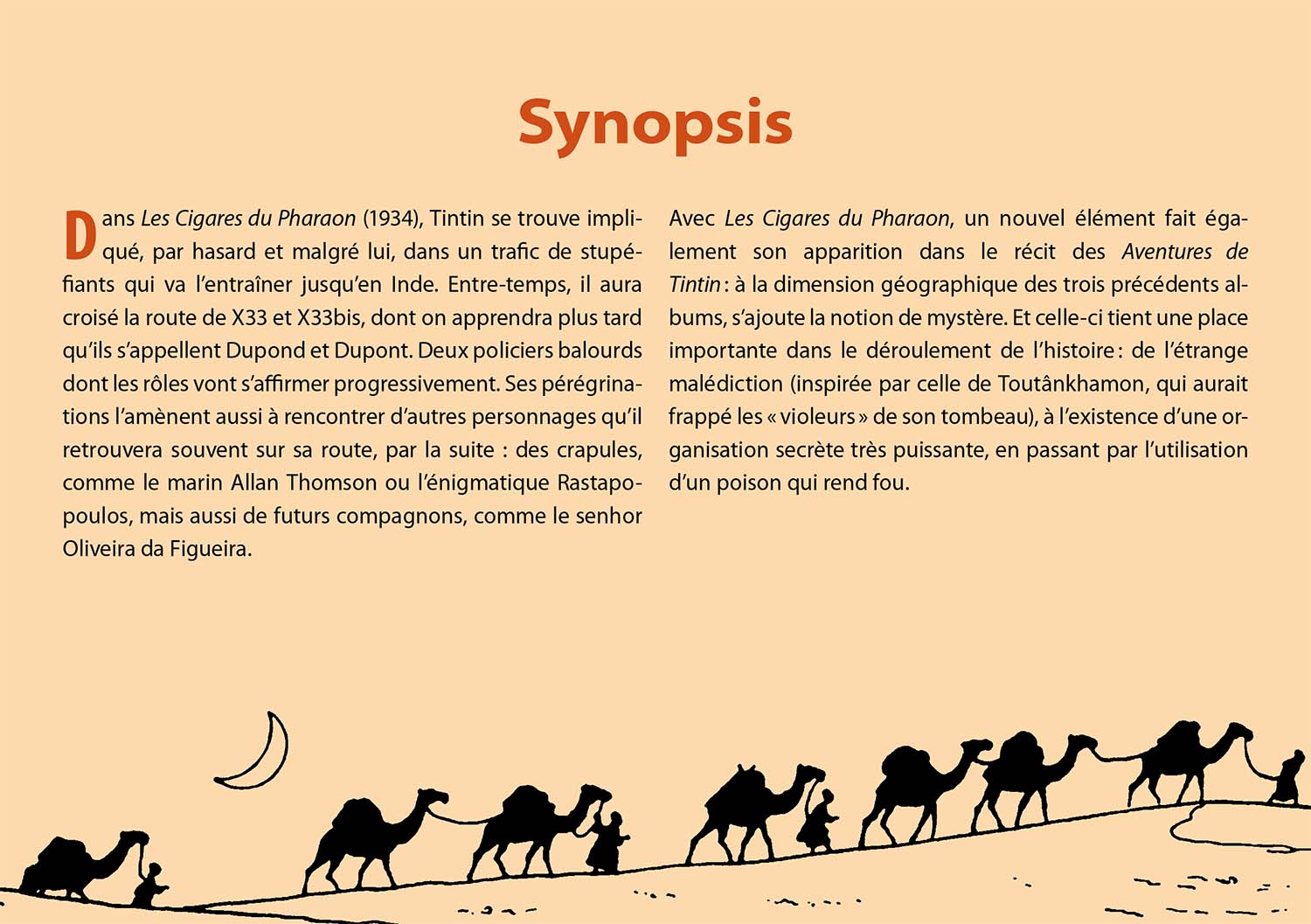 Dans Les Cigares du Pharaon (1934), Tintin se trouve impliqué, par hasard et malgré lui, dans un trafic de stupéfiants qui va l’entraîner jusqu’en Inde. Entretemps, il aura croisé la route de X33 et X33bis, dont on apprendra plus tard qu’ils s’appellent Dupond et Dupont. Deux policiers balourds dont les rôles vont s’affirmer progressivement. Ses pérégrinations l’amènent aussi à rencontrer d’autres personnages qu’il retrouvera souvent sur sa route, par la suite : des crapules, comme le marin Allan Thomson ou l’énigmatique Rastapopoulos, mais aussi de futurs compagnons, comme le senhor Oliveira da Figueira.