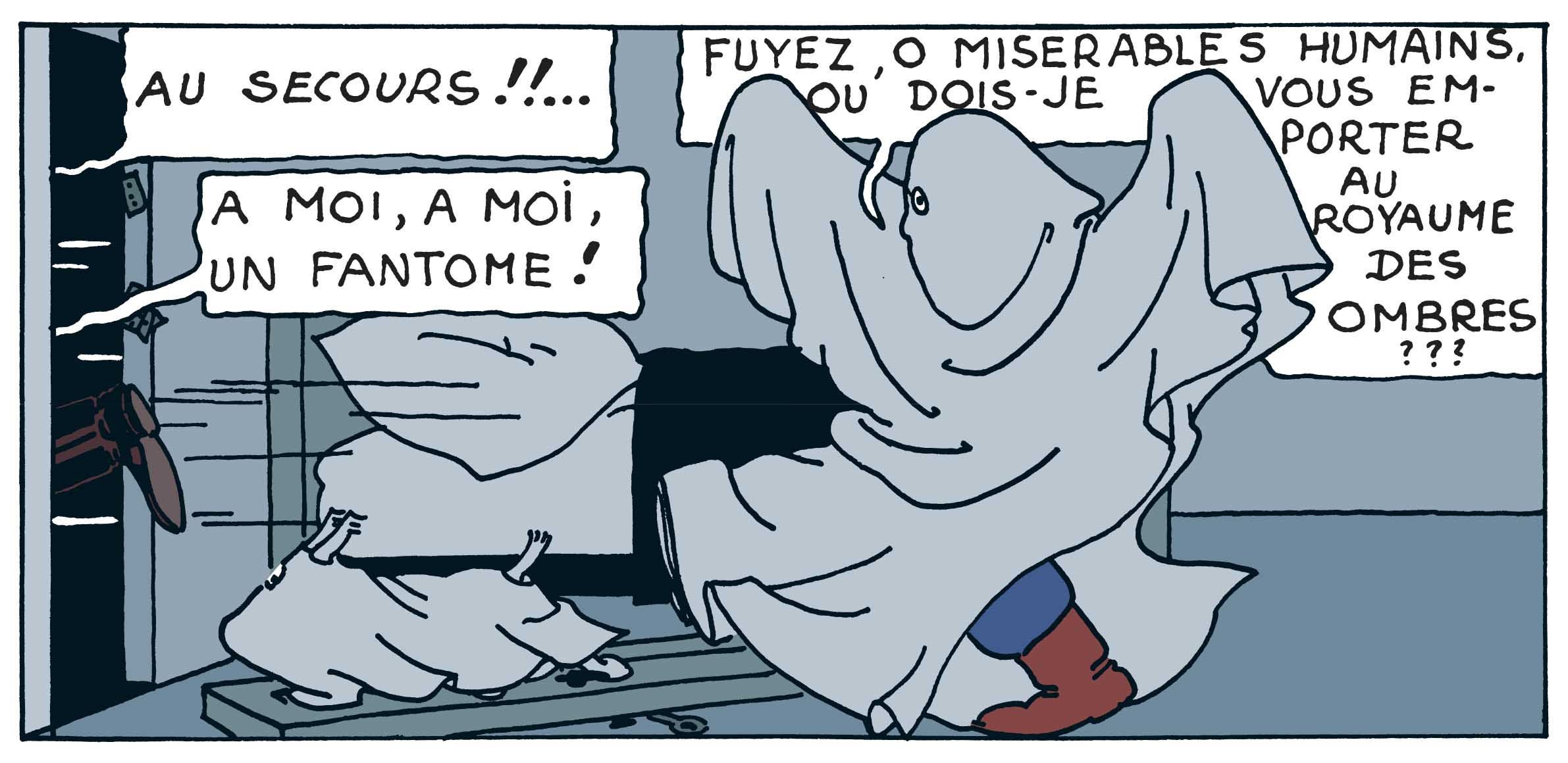 Mais tel et pris qui croyait prendre puisqu’en pénétrant dans la chambre, les lascars tombent sur deux fantômes apparus comme par magie. Sous ses longs drapés immaculés, les lecteurs reconnaîtront plus facilement la silhouette de Milou que celle de Tintin – d’autant plus que ses oreilles et sa queue dépassent. Car ici, point de manifestation surnaturelle mais plutôt un habile subterfuge pour faire fuir des assaillants un peu trop gênants.