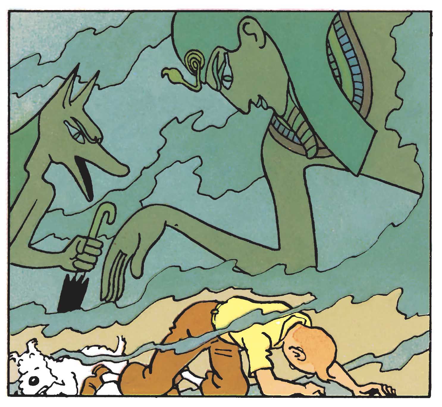 Dans Les Cigares du Pharaon, en revanche, les silhouettes d’Osiris et d’Anubis se forment spontanément dans les volutes de l’épaisse fumée verte qui inonde le tombeau de Kih-Oskh, où nos deux héros sont pris au piège. La présence de ces divinités funéraires majeures est loin d’être rassurante puisque leur principale mission consiste à accompagner les morts dans leur voyage vers l’au-delà.