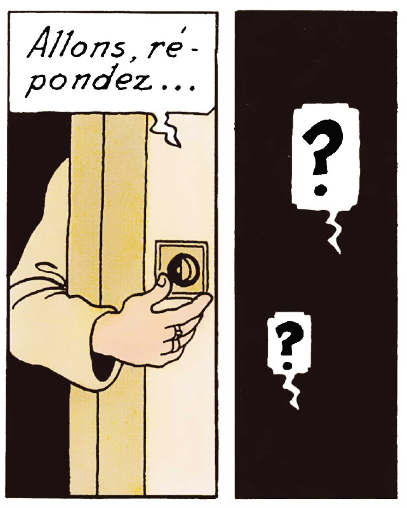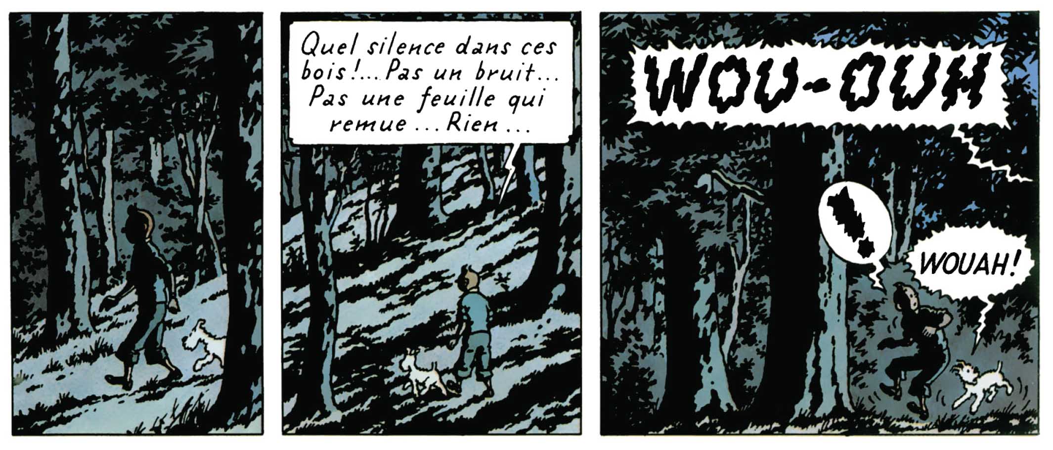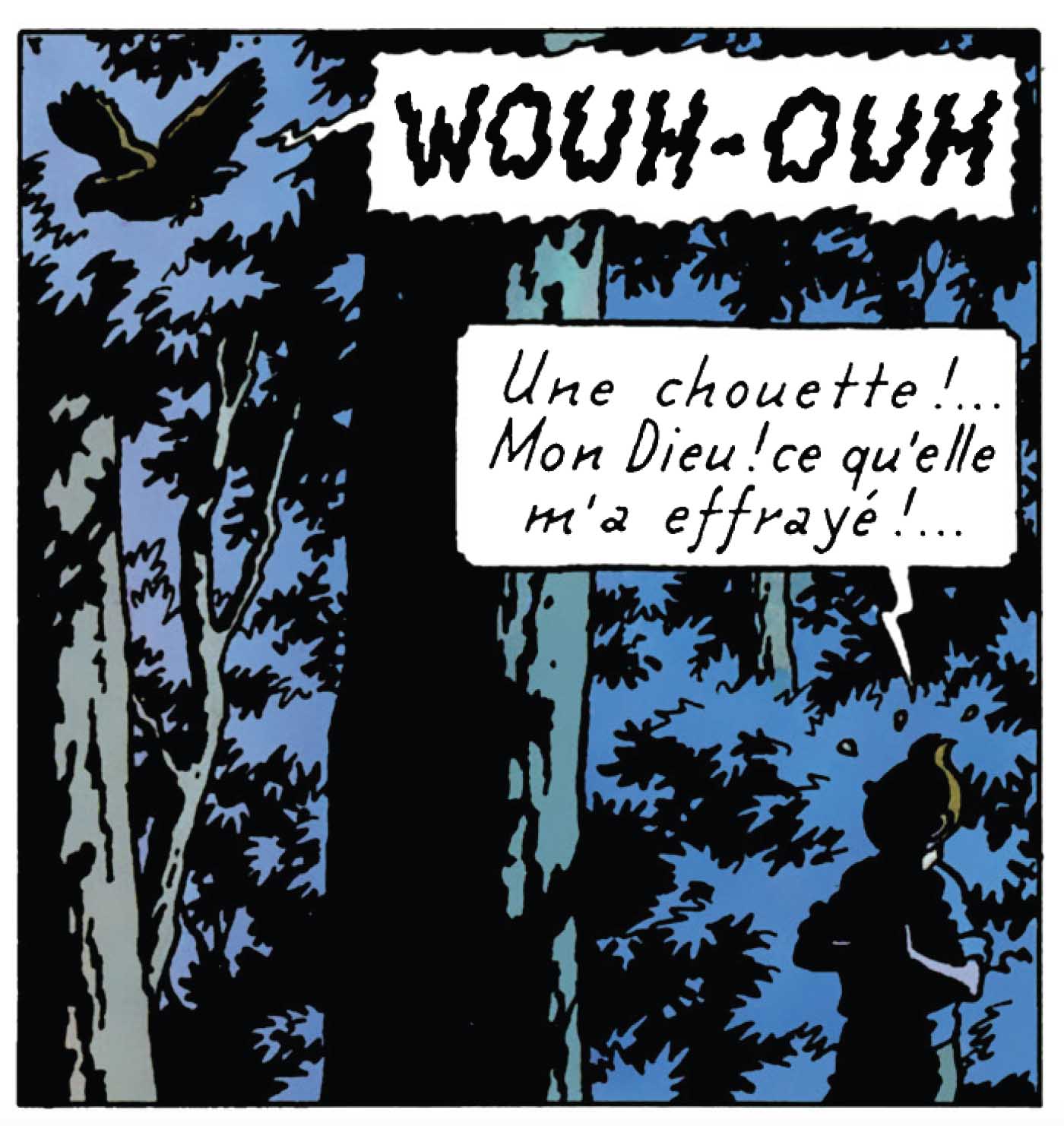 Il est vrai que, dans ces conditions, la vision – premier repère sensoriel – est mise à mal et est alors naturellement supplée par une ouïe exacerbée. De fait, la moindre manifestation sonore s’en trouve décuplée. Pour preuve, dans Les Bijoux de la Castafiore, Tintin et Milou sursautent au premier hululement de chouette, alors qu’ils marchent tous les deux dans le paisible bois dormant qui jouxte le château de Moulinsart.