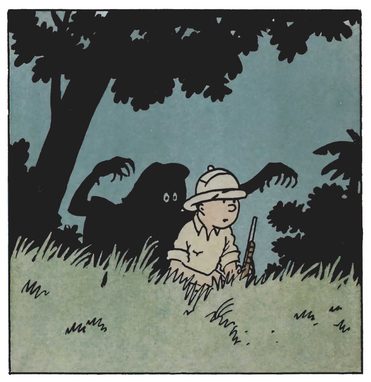 Leur graphisme découpé et accentué offre, en effet, libre cours à l’imagination. A la sienne, bien sûr, mais aussi à celle de ses lecteurs. De fait, croqués ainsi, l’homme-léopard vu dans Tintin au Congo se détache très distinctement de l’arrière-plan nocturne, sans nuance, uniquement matérialisé par un aplat à peine coloré.
