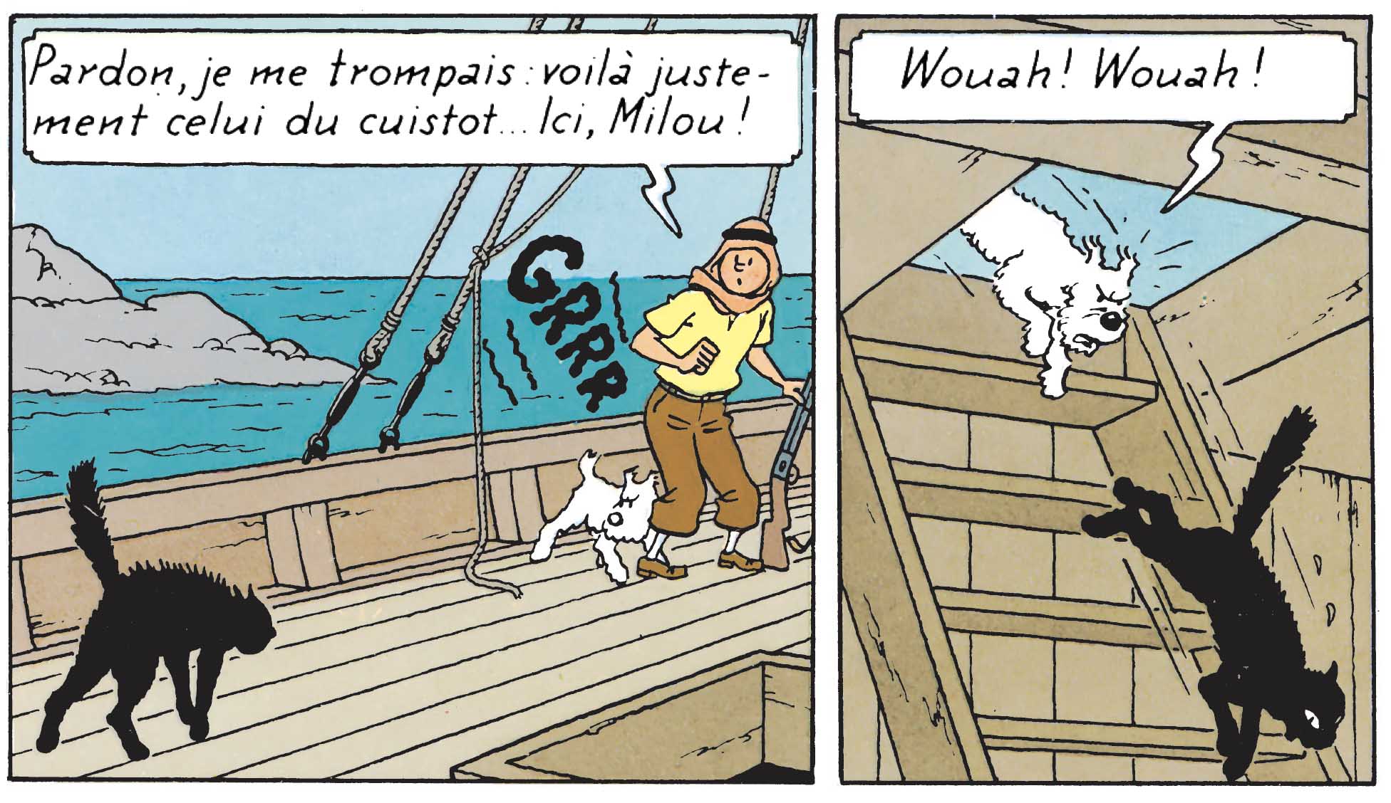 D’ailleurs, c’est précisément ce qui arrive au chat noir des Cigares du Pharaon. Toutes griffes dehors, LA star des croyances populaires fait, bien entendu, une apparition remarquable et remarquée, mais de très courte durée. Le félin miniature à la robe d’ébène hérissée a beau se tenir droit sur ses pattes, il n’en est pas moins effrayé lorsque Milou se jette sur lui pour lui faire débarrasser – au plus vite – le plancher.