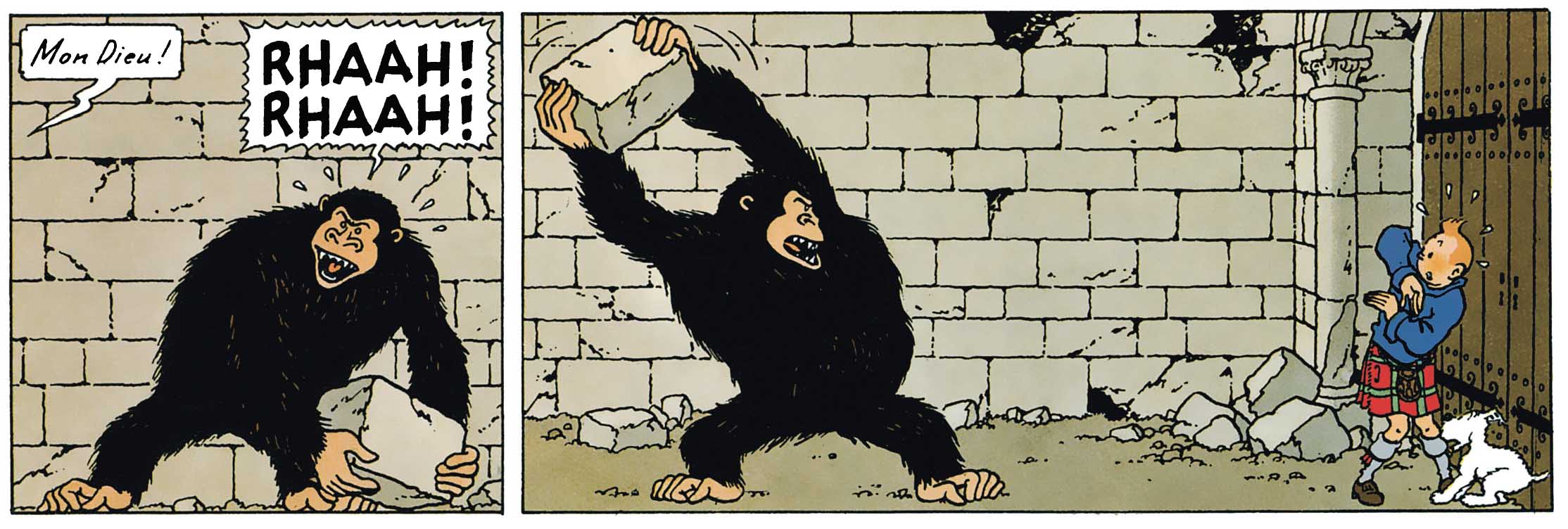 De fait, à l’instar du célèbre King Kong – dont le mythe a lui aussi été créé de toute pièce –, tous deux crient et grognent avec une violence inouïe, à en glacer le sang. Mais cela s’arrête-là car s’ils font peur, c’est uniquement à cause des ragots et des fausses croyances que l’on nourrit à leur égard : « Ne riez pas jeune homme. Je parle de la bête qui vit sur l’Ile Noire, dans les ruines du château de Ben More, celle qui dévore tous ceux qui ont la témérité de s’aventurer par-là », explique un autochtone, en kilt et béret, pour dissuader Tintin d’aller à sa rencontre. Ou encore : «… Lui très méchant ! Manger yeux et mains hommes par lui tués », précise un sherpa à propos de l’Abominable Homme des Neiges.