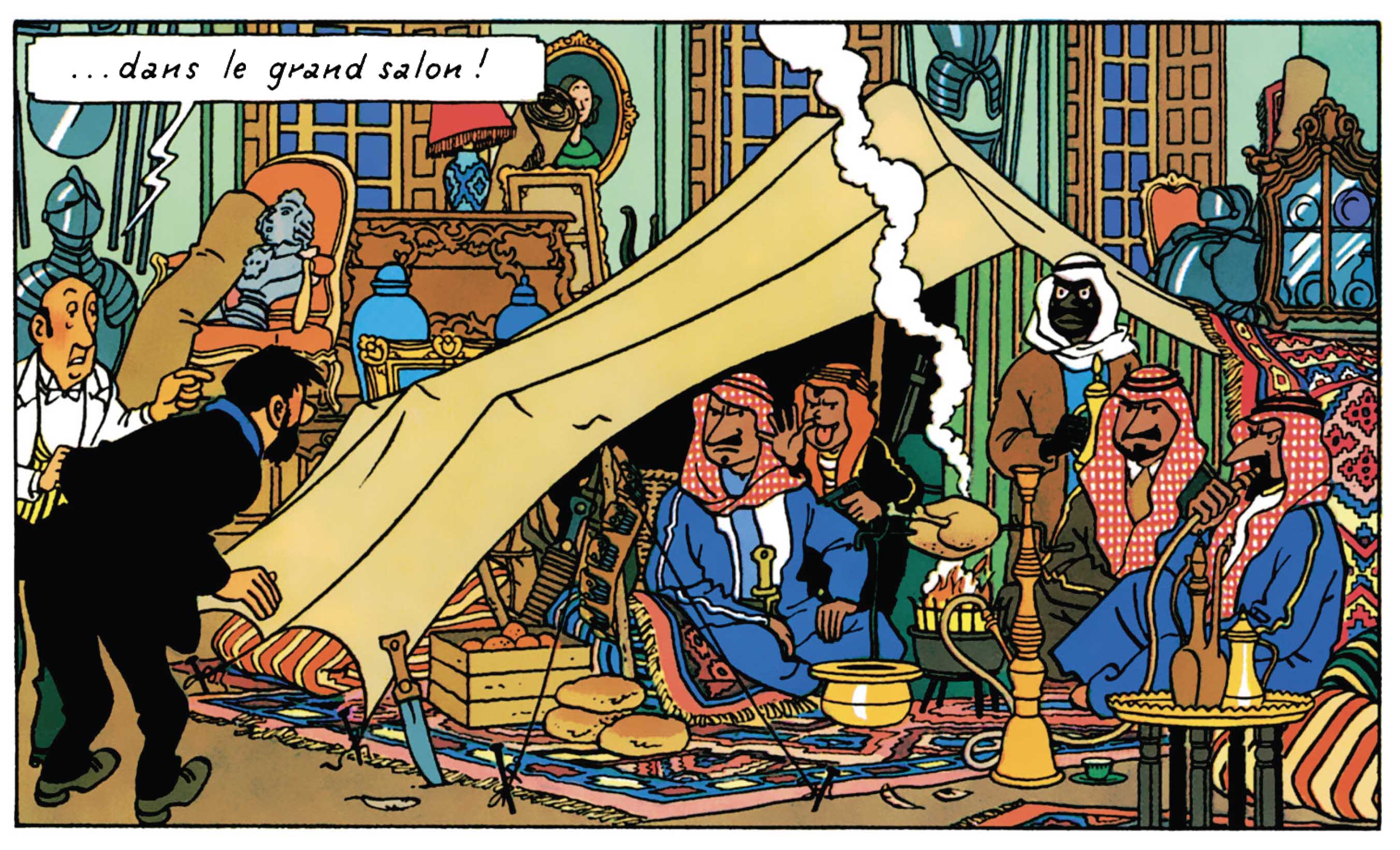 Et s’il ne va pas aux pratiques culinaires étrangères, ce sont elles qui viennent à lui… ou plutôt s’invitent chez ses amis comme c’est le cas dans Coke en Stock, lorsque les hommes de l’émir Mohammed Ben Kalish Ezab investissent le salon du capitaine Haddock pour installer – comme ils le font d’ordinaire dans le désert – une tente berbère. Un joli petit coin d’Arabie sous les dorures de Moulinsart. Dépaysement et bonne chère rôtie garantis !