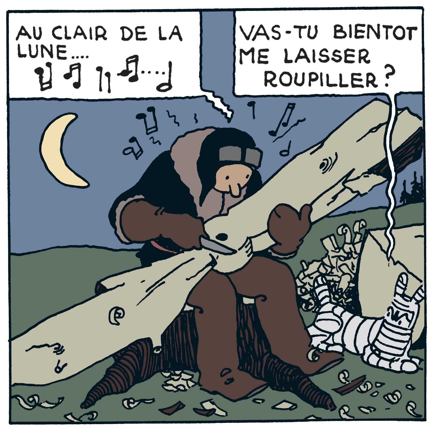 Ainsi, dans Tintin au pays des Soviets, le mythique « Au clair de la Lune » a plusieurs effets. En premier lieu, celui d’évoquer le temps qui passe. Ensuite, si Hergé fait chanter son héros, c’est pour souligner l’ampleur de la tâche qu’il lui incombe de réaliser. Car, pour pouvoir poursuivre ses aventures, ce dernier s’est lancé dans un défi tout aussi improbable qu’ardu. A savoir : tailler une hélice d’avion - au canif - dans du bois d’arbre. Rien que ça ! Mais comme impossible n’est pas Tintin, le jeune homme parvient logiquement à ses fins. Et bien sûr, pour finir, Hergé ne pouvait s’empêcher de se rire de la situation puisque son petit protégé réalise ce prodige, dans les conditions d’éclairement justement décrites par la chanson.