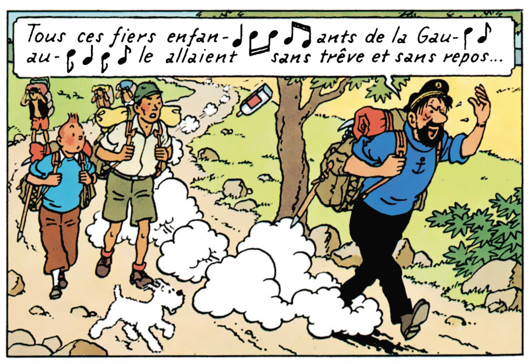 Dans Tintin au Tibet, après trois longues cases superposées – qui relatent en peu de mots et d’images les faits –, Hergé laisse le soin au capitaine Haddock d’assurer l’enchaînement avec le tableau suivant. Mais l’homme est fatigué. Du coup, il a besoin de boire une goutte de sa potion magique préférée. Aussitôt dit, aussitôt fait et le voici ragaillardi… et enchanté. C’est donc au pas de charge et en s’égosillant sur une marche militaire intitulée « Le régiment de Sambre-et-Meuse » qu’il tente de motiver les troupes, histoire qu’elles accélèrent le mouvement.