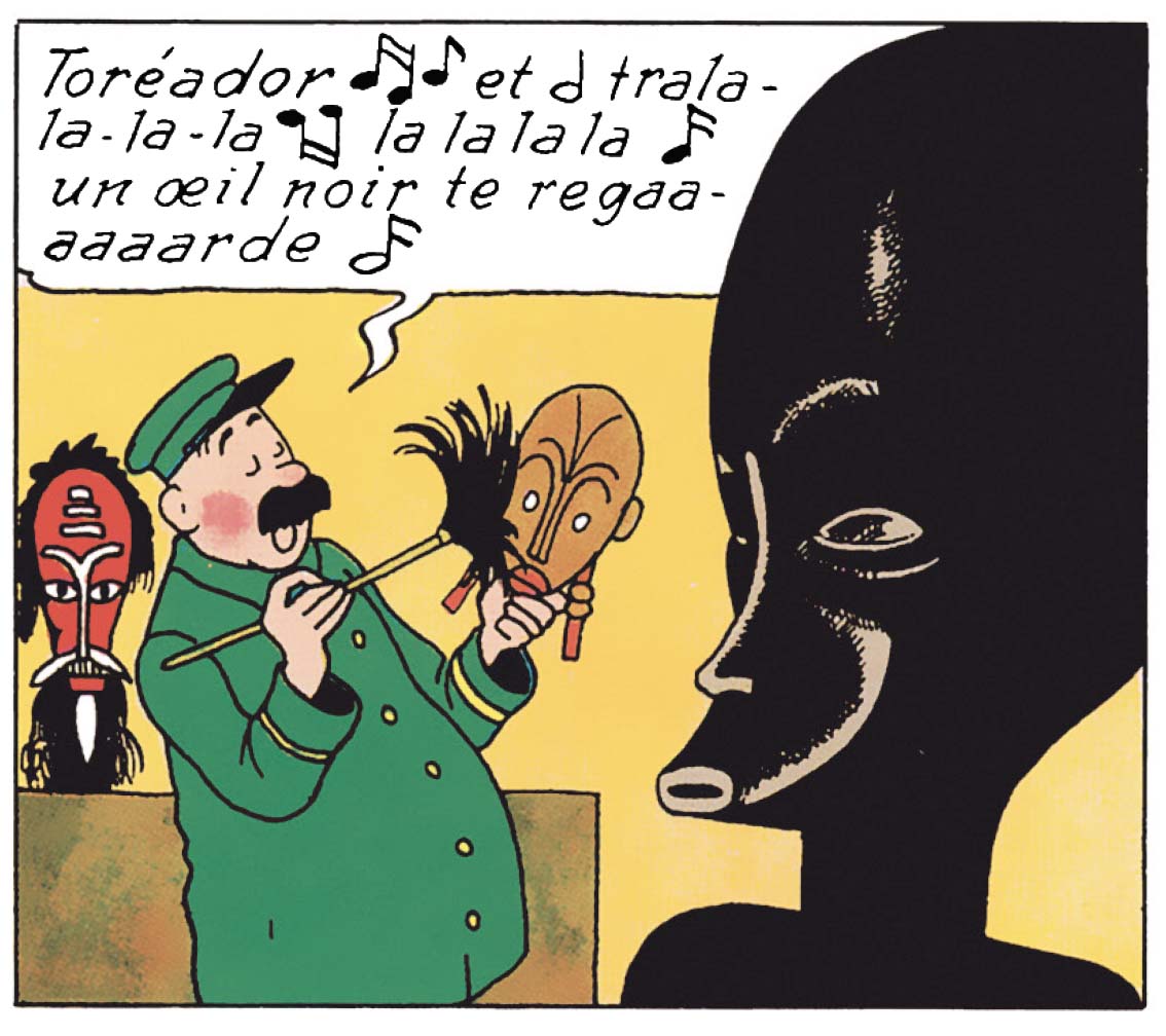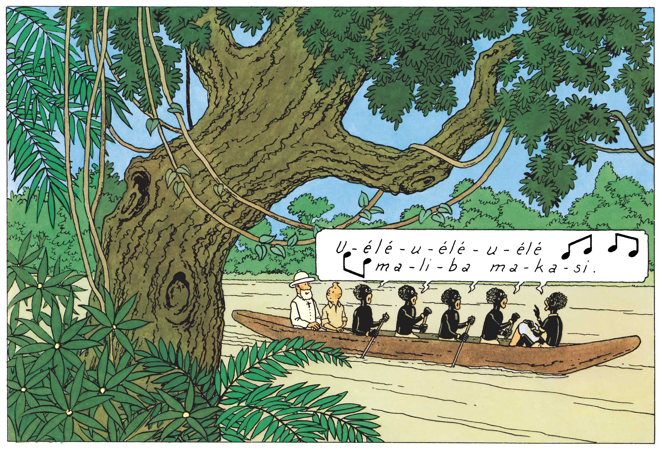 Ainsi, à la mi-album de Tintin au Congo, de jeunes autochtones à bord d’une pirogue rament de concert sur « Uélé maliba makasi ». Pour l’occasion, Hergé a même transformé cette berceuse africaine en "chant de travail" (ou work song), en séparant chaque syllabe par des tirets, de façon à soutenir leurs efforts et de permettre aux lecteurs, de suivre la cadence ainsi imposée.