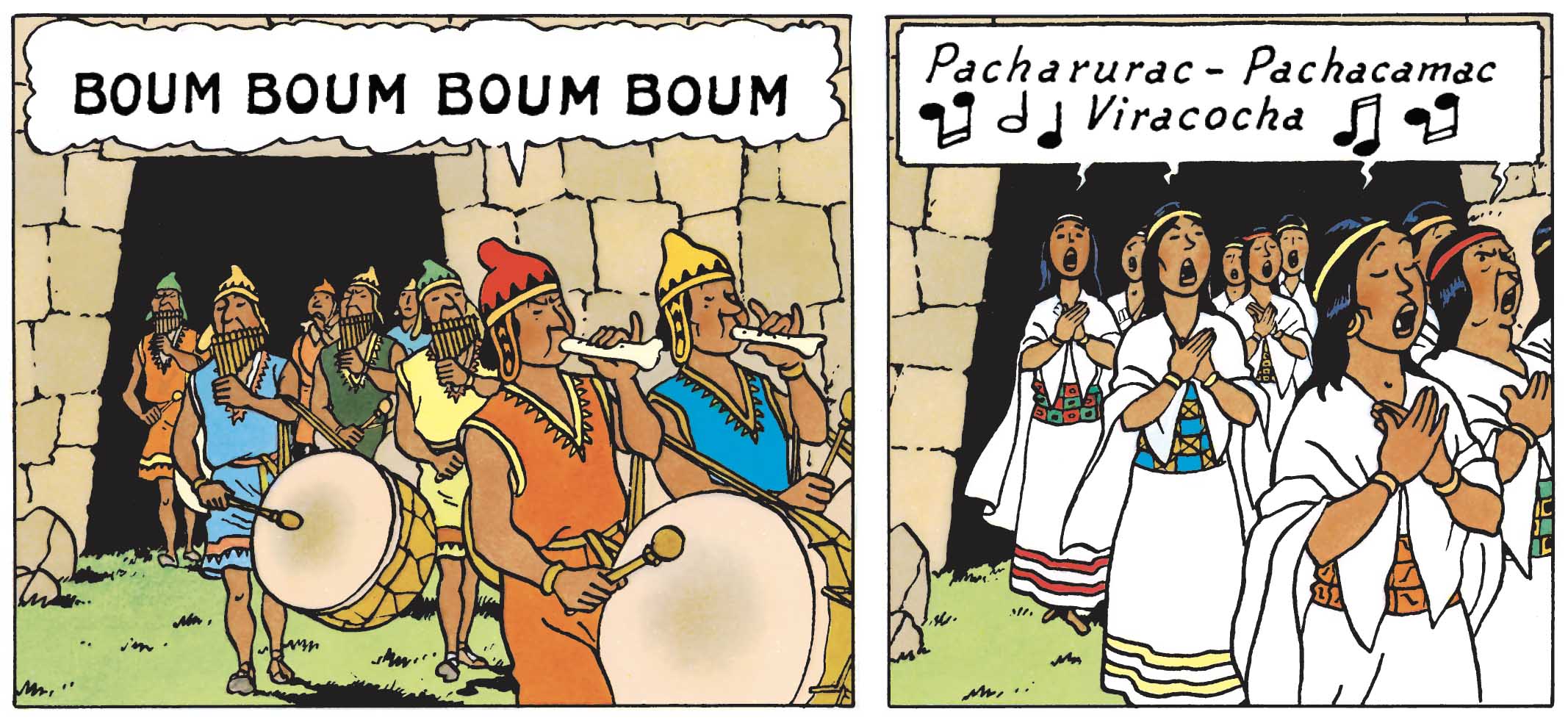 Même astuce également dans Le Temple du Soleil. Bien que cette fois-ci, ce sont des noms de divinités qui sont égrenés au fil des tirets : « Pacharurac – Pachacamac – Viracocha ». Chose logique vue qu’ici, il s’agit de les invoquer – et même, de les convoquer – dans le cadre d’un sacrifice rituel. En outre, grâce à ce cœur… euh, chœur de femmes qui bat au rythme des tambours, Hergé offre à ses lecteurs une immersion culturelle dépaysante et à son récit, une dimension ethnographique surprenante.