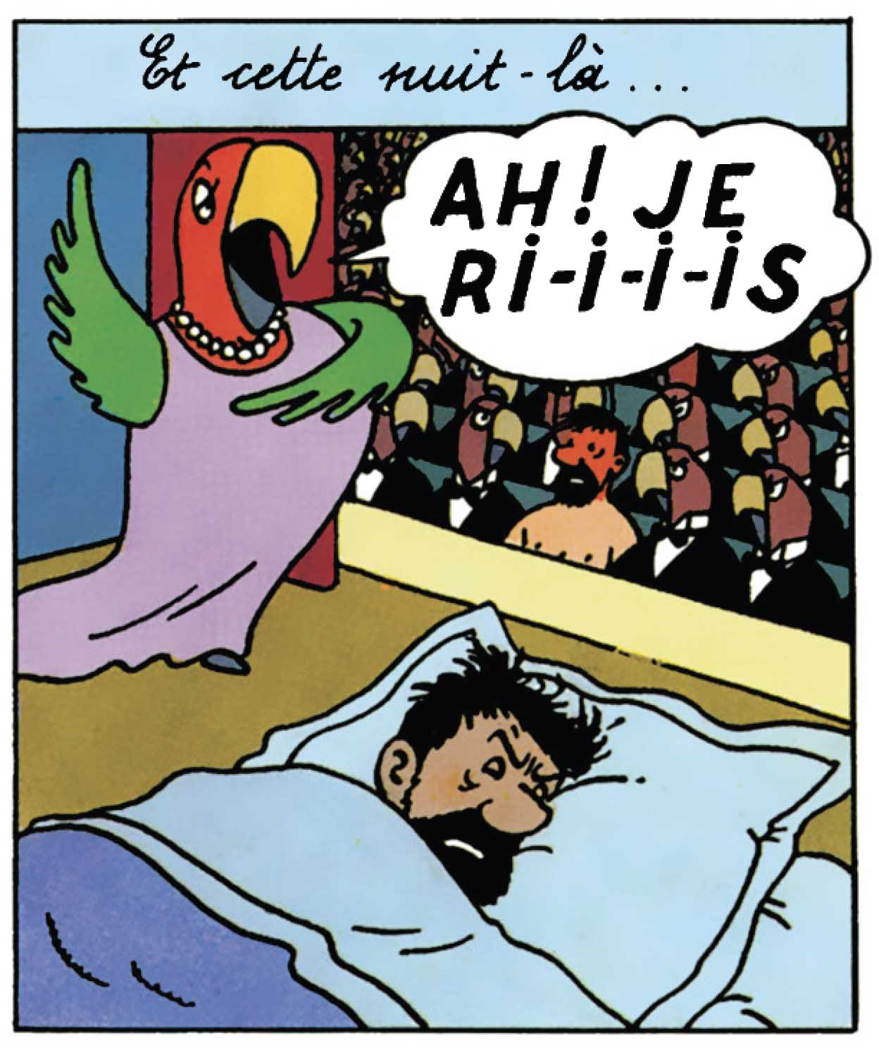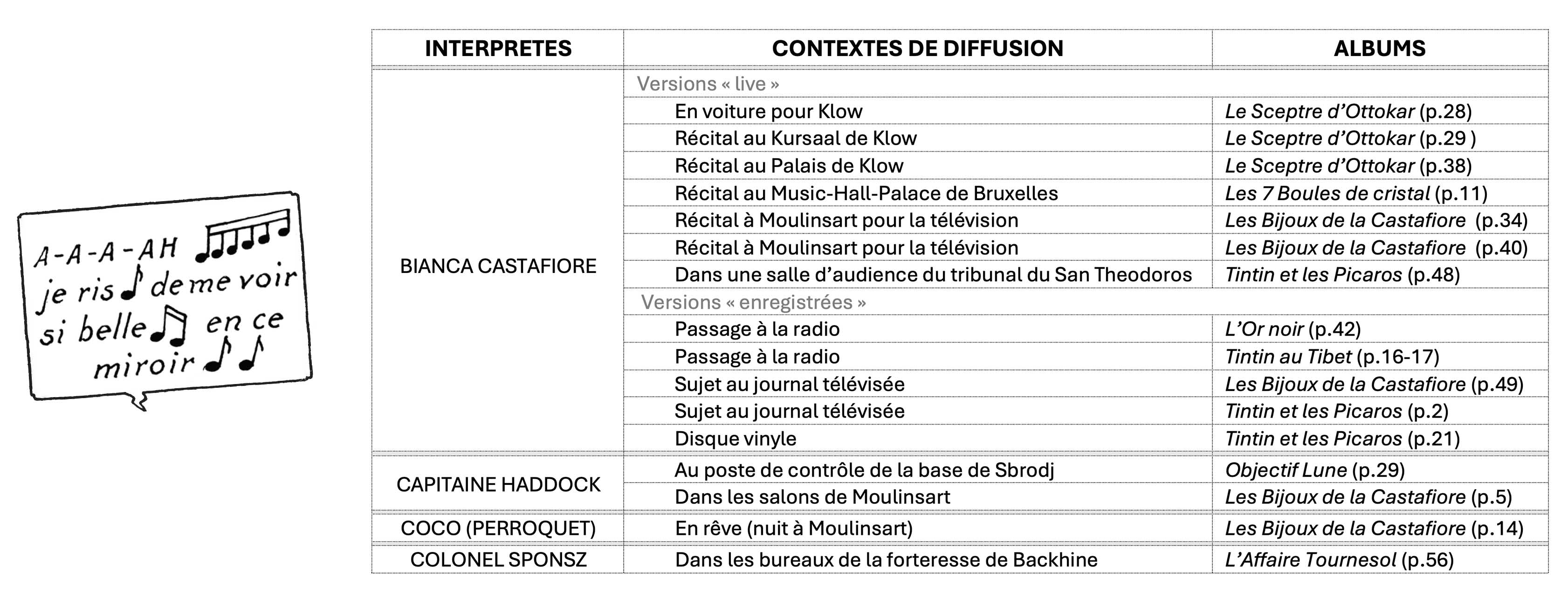 Les lecteurs pourront aussi constater, qu’à force de persuasion – et de répétition, surtout –, elle est même parvenue à faire des émules. Et ce, tant parmi ses admirateurs que parmi ses détracteurs. Aussi, dans L’Affaire Tournesol, le colonel Sponsz entonne machinalement les premières notes de ce morceau de bravoure pour afficher sa bonne humeur du moment. Tandis que le capitaine Haddock, lui, se risque à la chose, dans Objectif Lune et dans Les Bijoux de la Castafiore, pour se moquer un peu plus de l’assourdissante diva. D’ailleurs, dans cet album, il semble avoir le plus grand mal à se défaire de cet air. Celui-ci l’obsède jusque dans son sommeil, au point même d’en cauchemarder la nuit. Et, pour l’occasion, ce n’est pas lui, mais Coco qui persifle la rengaine.