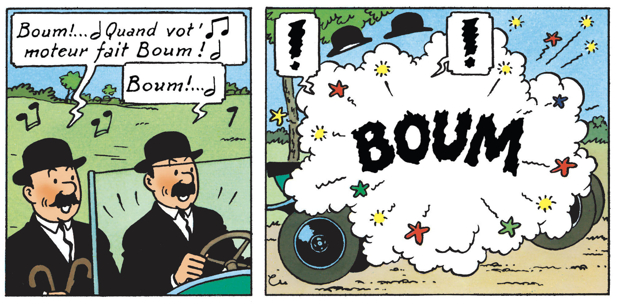 Plus signifiante encore, l’ouverture en fanfare des Dupondt dans L’Or noir. Ici, tous les ingrédients sont réunis pour que la scène d’exposition soit étonnante… ou plutôt, détonante : une pompe à essence, un briquet, un pot d’échappement fumant et pour couronner le tout, le célèbre duo de choc de la police belge qui entonne « Boum ! » de Charles Trenet. Aucun doute possible, l’enquête qui va suivre sera forcément… explosive !