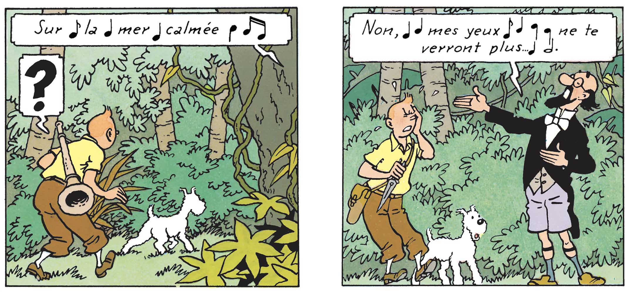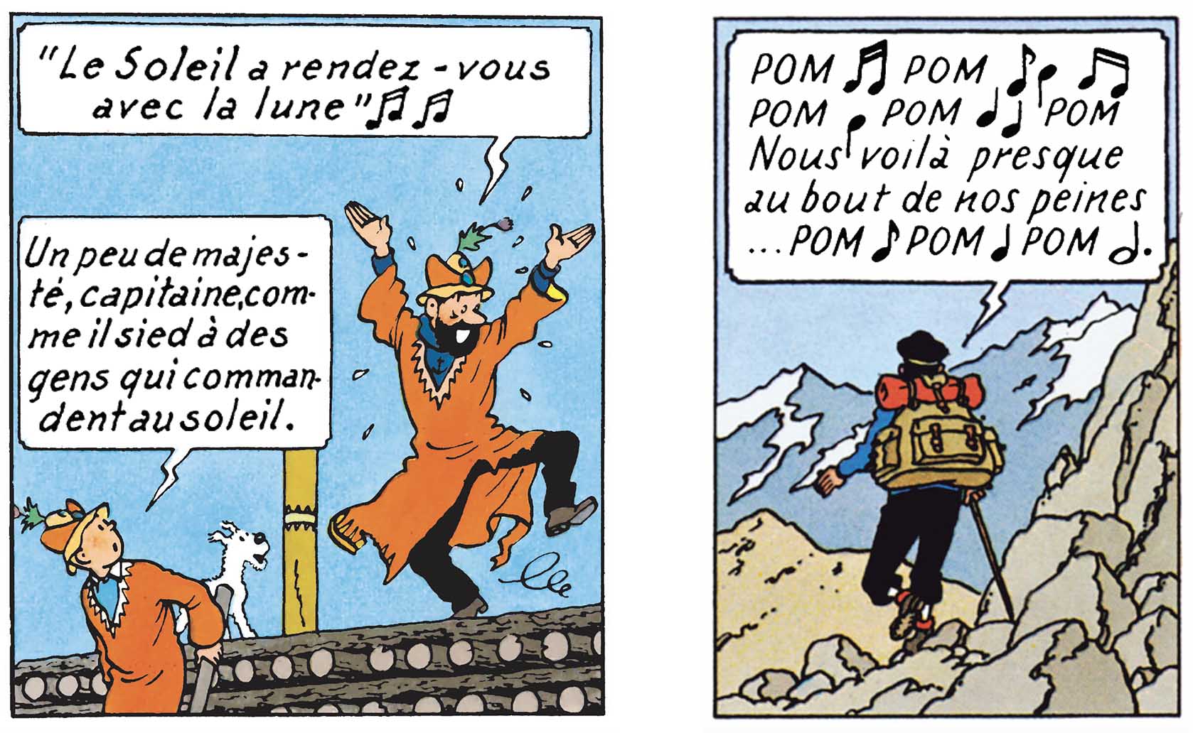 L’astuce musicale fonctionne aussi très bien, en guise de dénouement. Sûrement parce que la chute paraît plus douce lorsqu’elle est savamment orchestrée. Raison pour laquelle, dans Le Temple du Soleil, le capitaine Haddock entonne, à son tour, un air du « Fou chantant ». En l’occurrence : « Le Soleil et la Lune ». Un titre idoine surtout, après qu’une éclipse salvatrice ait mis un terme au supplice du bûcher auquel, lui et ses amis, étaient condamnés. Dans Tintin au Tibet, il renouvelle l’expérience, histoire de terminer en beauté mais surtout, sur une note de légèreté, une aventure particulièrement riche en émotions. Aussi fredonne-t-il, non sans un certain soulagement : « Nous voilà presque au bout de nos peines ».