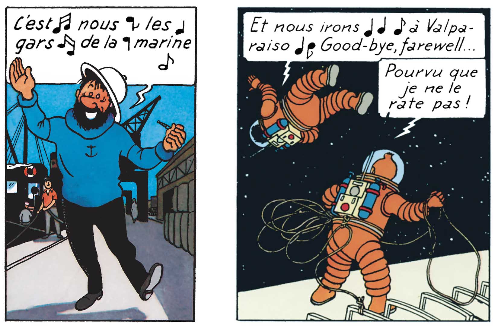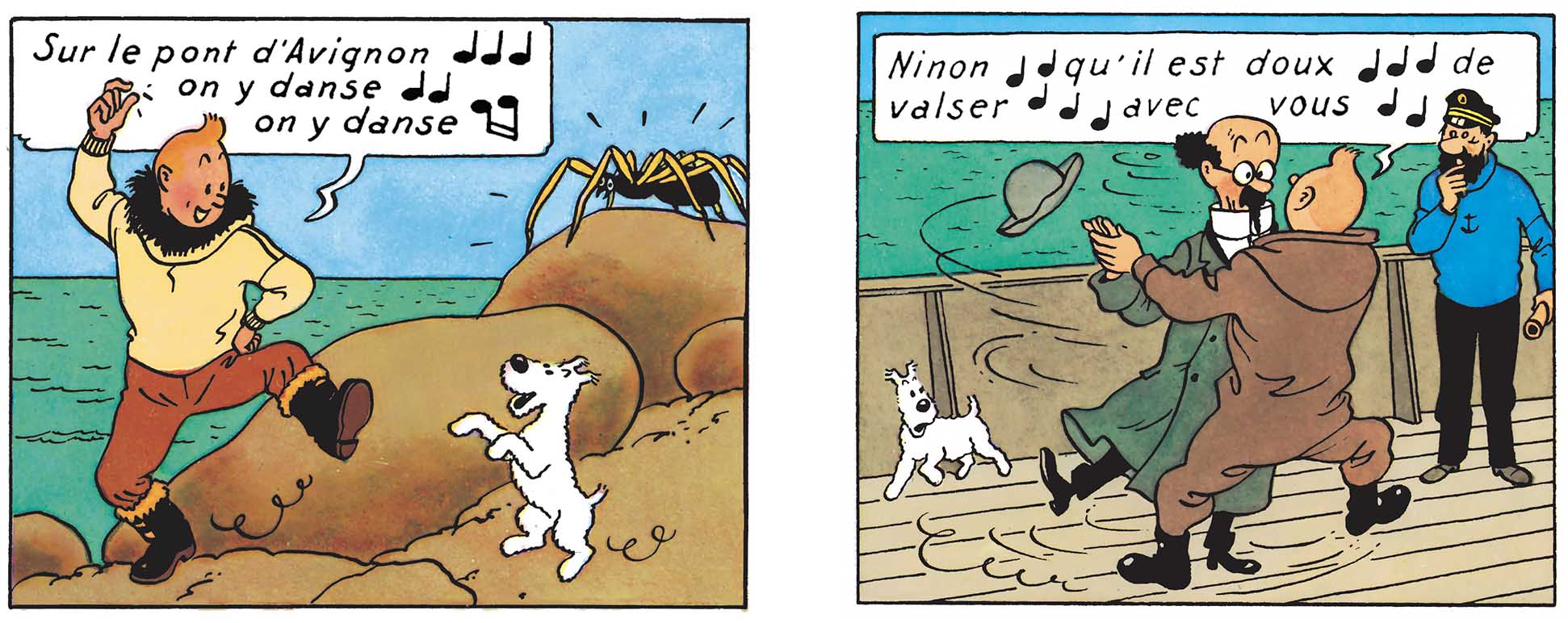En plus d’être des odes à la joie, ces passages heureux donnent un relief singulier à leurs découvertes. Car pour eux, chaque avancée compte. C’est une bonne nouvelle qu’il convient de célébrer. La preuve éclatante qu’ils sont en bonne voix… euh, voie de résoudre leur enquête. Tintin, en particulier, semble apprécier ces instants de grâce puisque dans L’Etoile mystérieuse et Le Trésor de Rackham le Rouge, il en est lui-même l’initiateur. Pour l’occasion, il interprète des classiques de la chanson française. En l’occurrence : « Sur le pont d’Avignon » et « Ninon je vous aime ». A noter que ces scènes de liesse se pratiquent, le plus souvent en duo ou en trio et, de préférence, sur un pied.