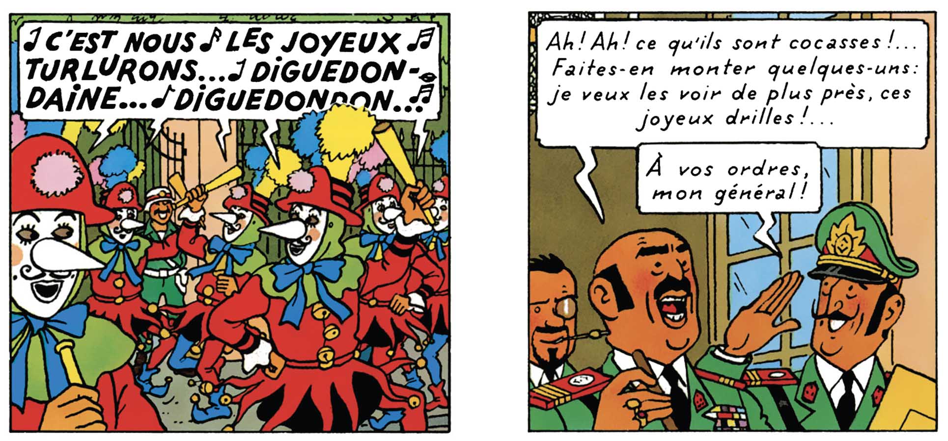 Comment parler d’allégresse sans évoquer « L’air des Joyeux Turlurons ». Cette création originale – pur fruit de l’imagination d’Hergé – est, effectivement, une invitation à la fête. Invitation à laquelle personne ne saurait résister. Pas même Tapioca, d’ailleurs. Le général dictateur de Tintin et les Picaros succombe vite – et même très vite – à ses rythmes endiablés et ce, dès les premières strophes chantées. Comme quoi, la musique adoucit vraiment les mœurs – et les cœurs, aussi.