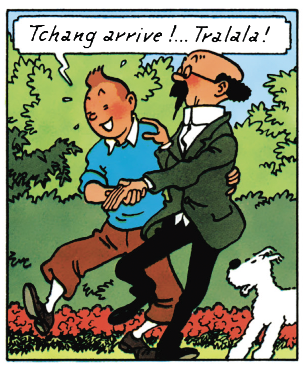 Plus neutre mais tout aussi efficace – surtout si elle s’accompagne d’un sautillement ou d’un pas de danse –, l’interjection « tralala » est également utilisée à plusieurs reprises par les héros d’Hergé, pour exprimer des bonheurs passagers, plutôt pétillants et guillerets. Ce qui est le cas, par exemple, dans Tintin au Tibet, lorsque le petit reporter se réjouit de l’arrivée imminente de son ami Tchang.