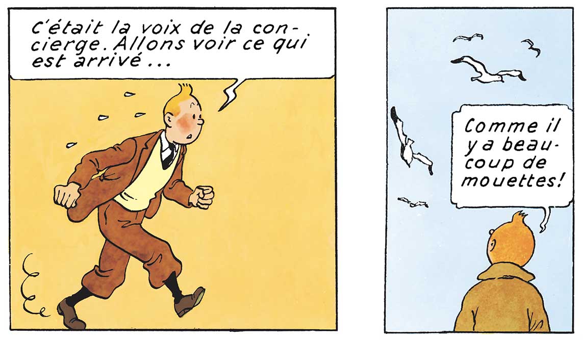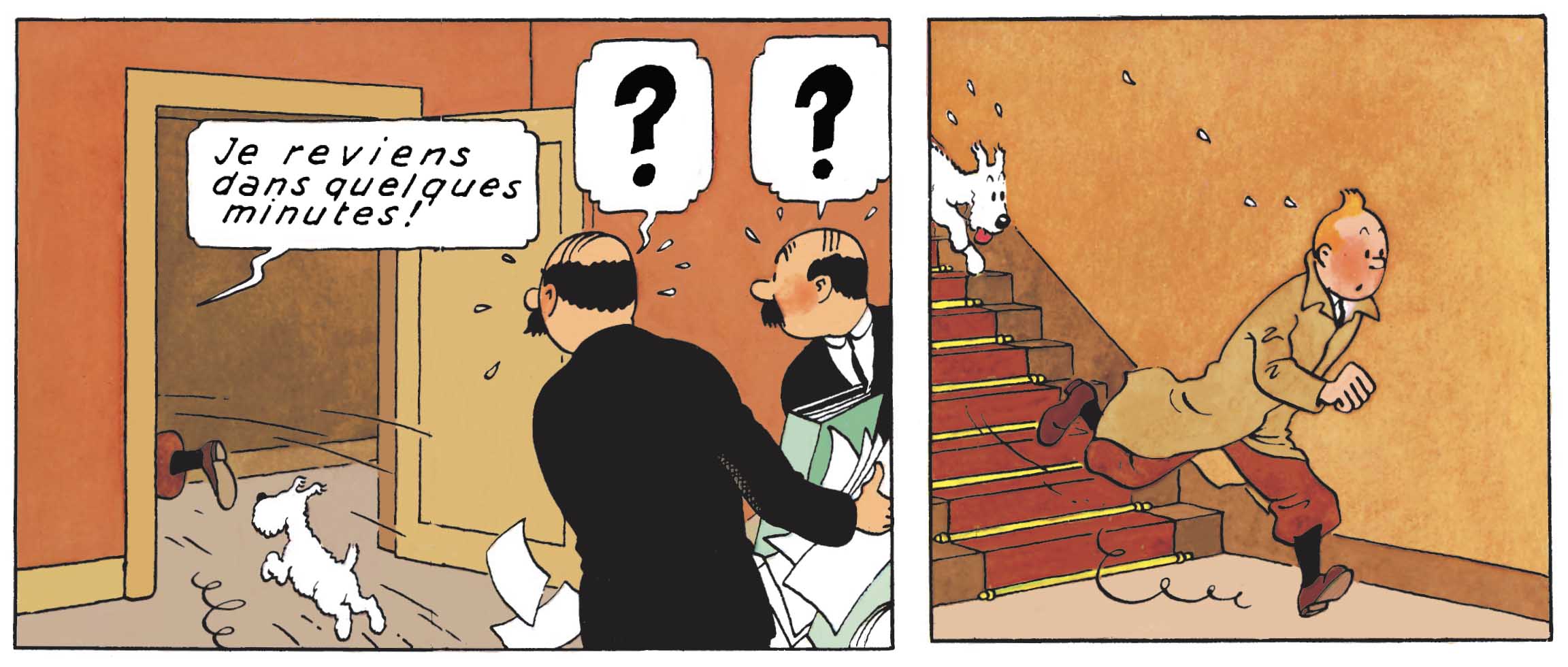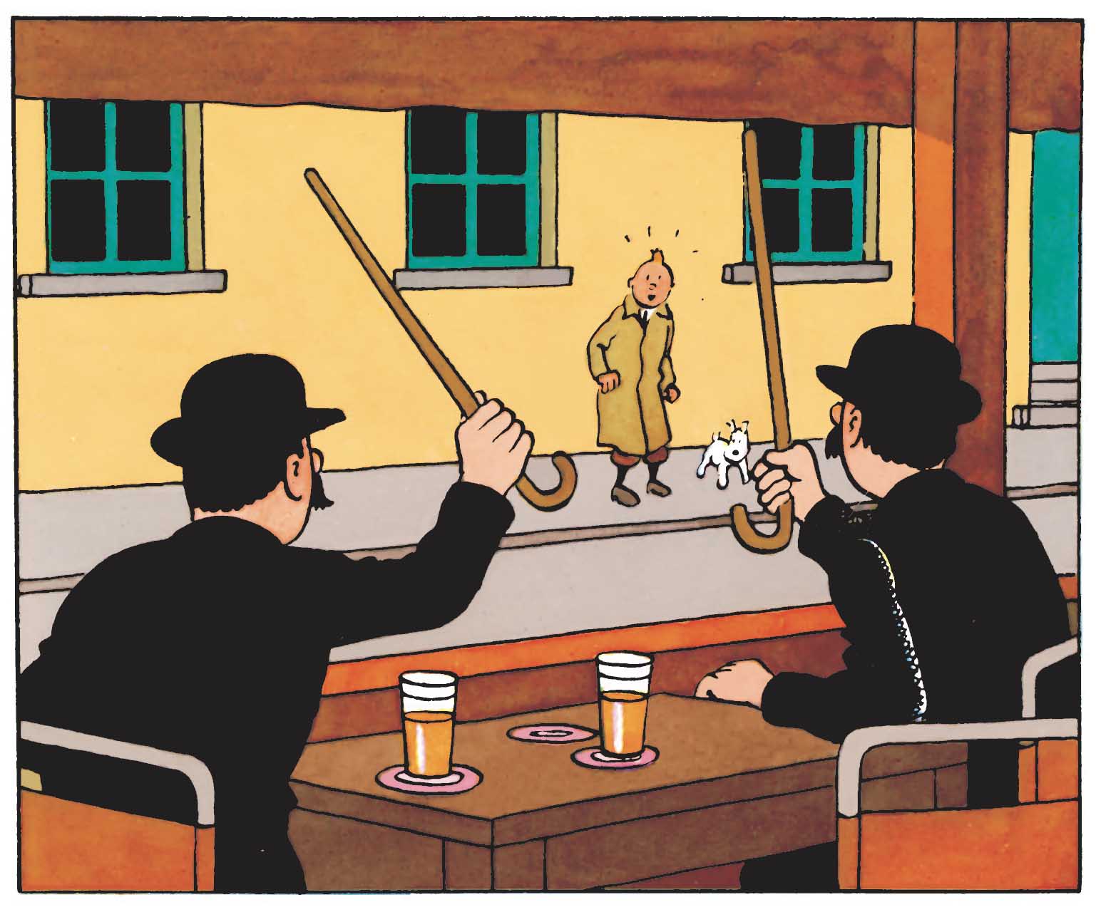 Ce principe de spatialisation fonctionne également très bien par juxtaposition de tons dégradés. La scène où l’on découvre les Dupondt, tranquillement assis à la terrasse d’un café, est d’ailleurs un excellent exemple de cette technique, appelée « perspective atmosphérique ». Des tons sombres sont effectivement utilisés pour caractériser les éléments des premiers plans tandis que, dans les suivants, ils sont traités avec plus de clarté et de luminosité.