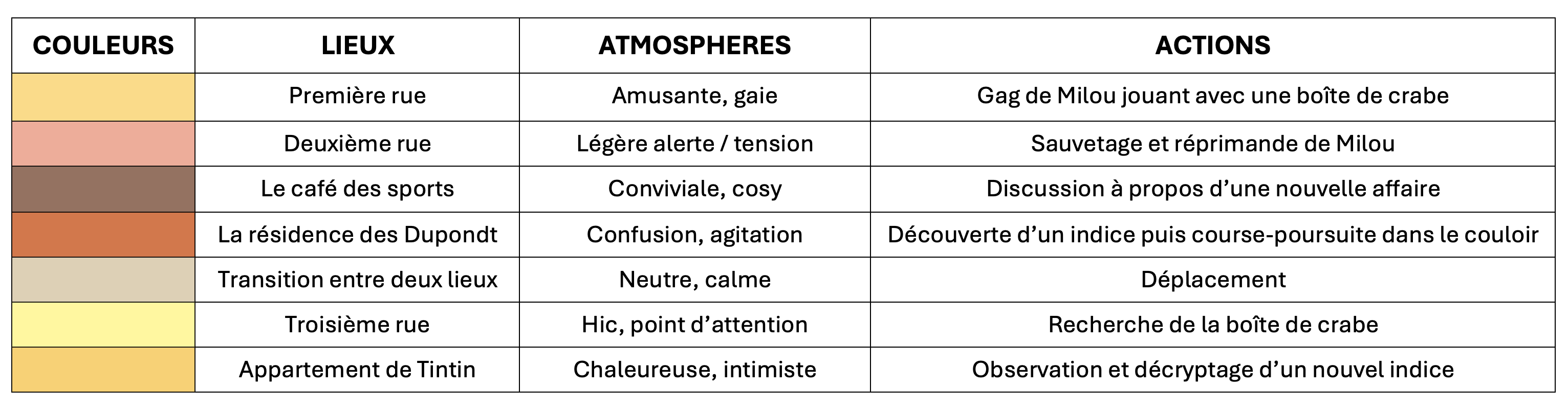 Sept pages, sept couleurs… Sapristi, cela voudrait-il dire qu’Hergé et ses équipes ont utilisé la couleur pour souligner le découpage des actions représentées ? Il semblerait, en effet. Car chaque valeur équivaut – grosso-modo – à une séquence donnée.