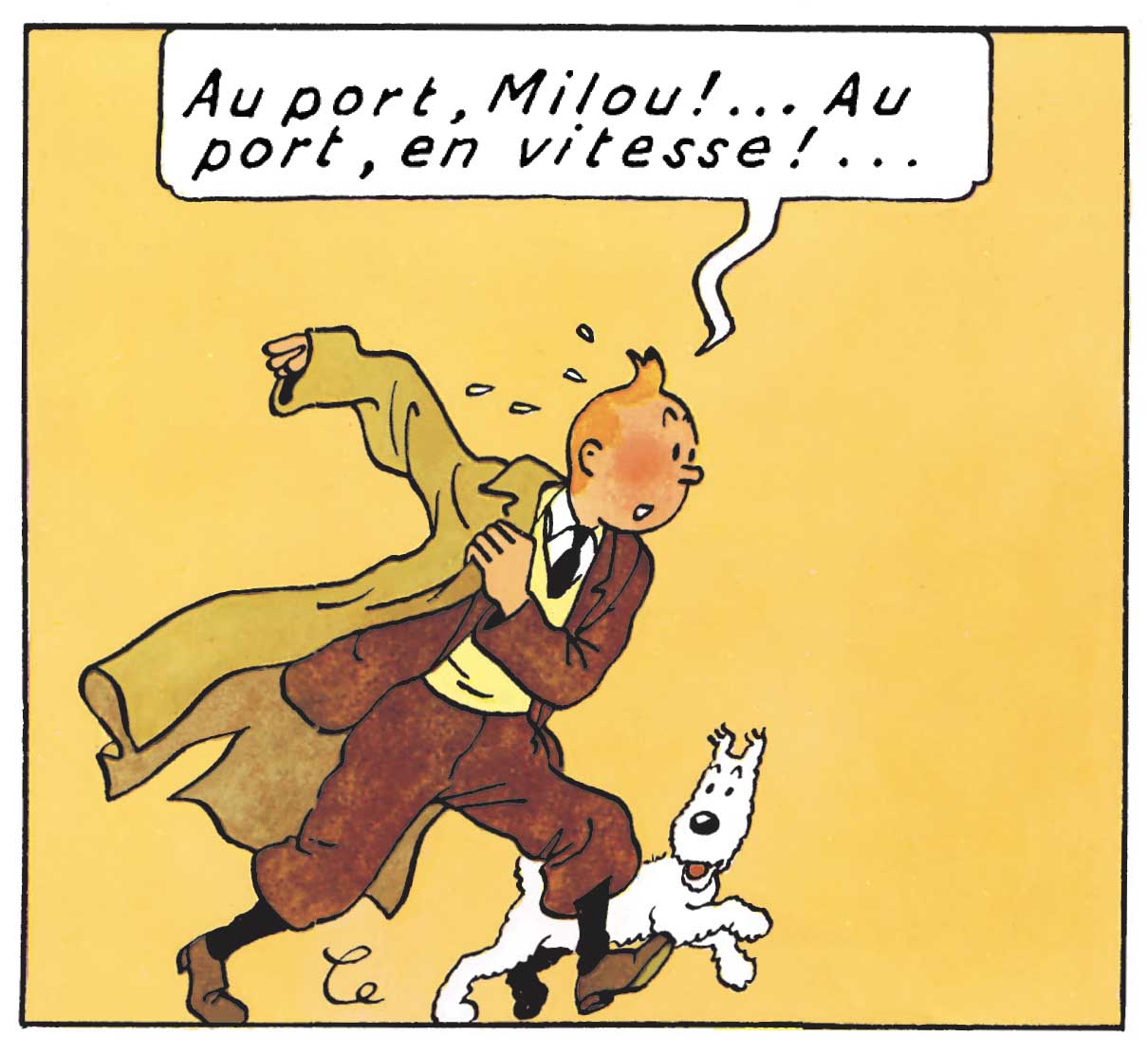 Après un tel mélange, une pause s’impose. Raison pour laquelle, une teinte neutre accompagne les personnages durant leur déplacement. Quand soudain, c’est la rupture. Une franche rupture, même. Car, très vite, un aplat jaune vif s’impose. Apparu tel un coup de projecteur, il occulte complétement l’arrière-plan, de façon à ce que les silhouettes, les gestes et les expressions se détachent très distinctement. Une manière efficace de souligner la mystérieuse disparition de la boîte de conserve, dénichée par Milou, cinq planches plus haut.