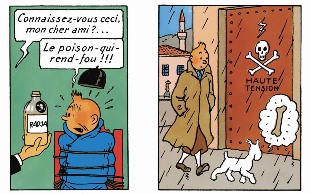 C’est indéniable, dans les Aventures de Tintin, la mort est omniprésente. Récurrente, aussi. Elle attend le petit reporter au tournant, à chaque instant. Mais heureusement pour lui, elle sonne toujours plusieurs fois avant de frapper. Elle annonce même, très clairement, la couleur en laissant, sur son passage, des signes avant-coureurs qui ne trompent pas. Du coup, Tintin tombe, plus souvent qu’à son tour, sur des têtes de mort… ou plutôt, « des têtes de l’emploi » devrait-on dire. Car, lorsqu’elles apparaissent, le jeune héros comprend aussitôt l’effet funeste du produit ou de la chose sur lesquels elles sont apposées.