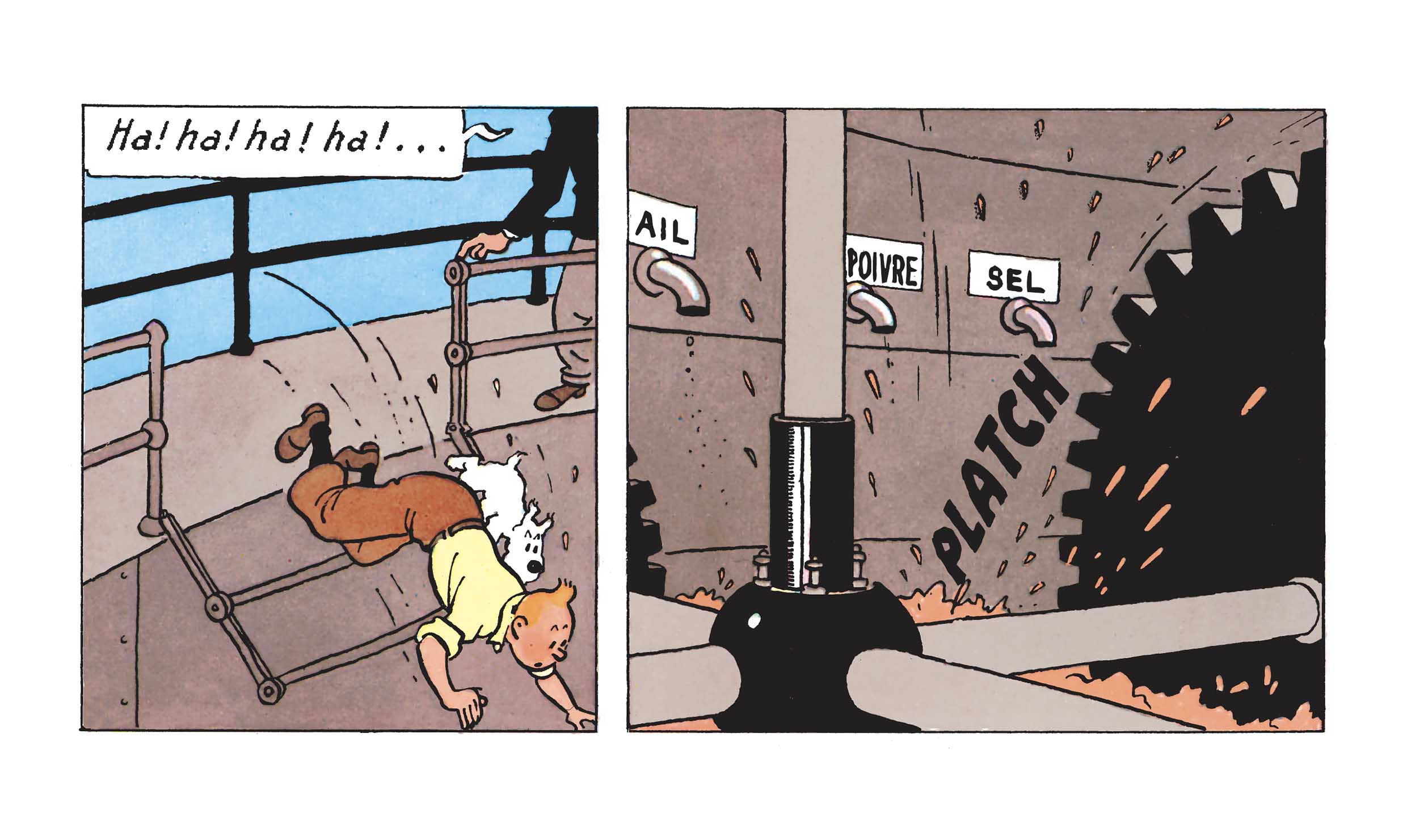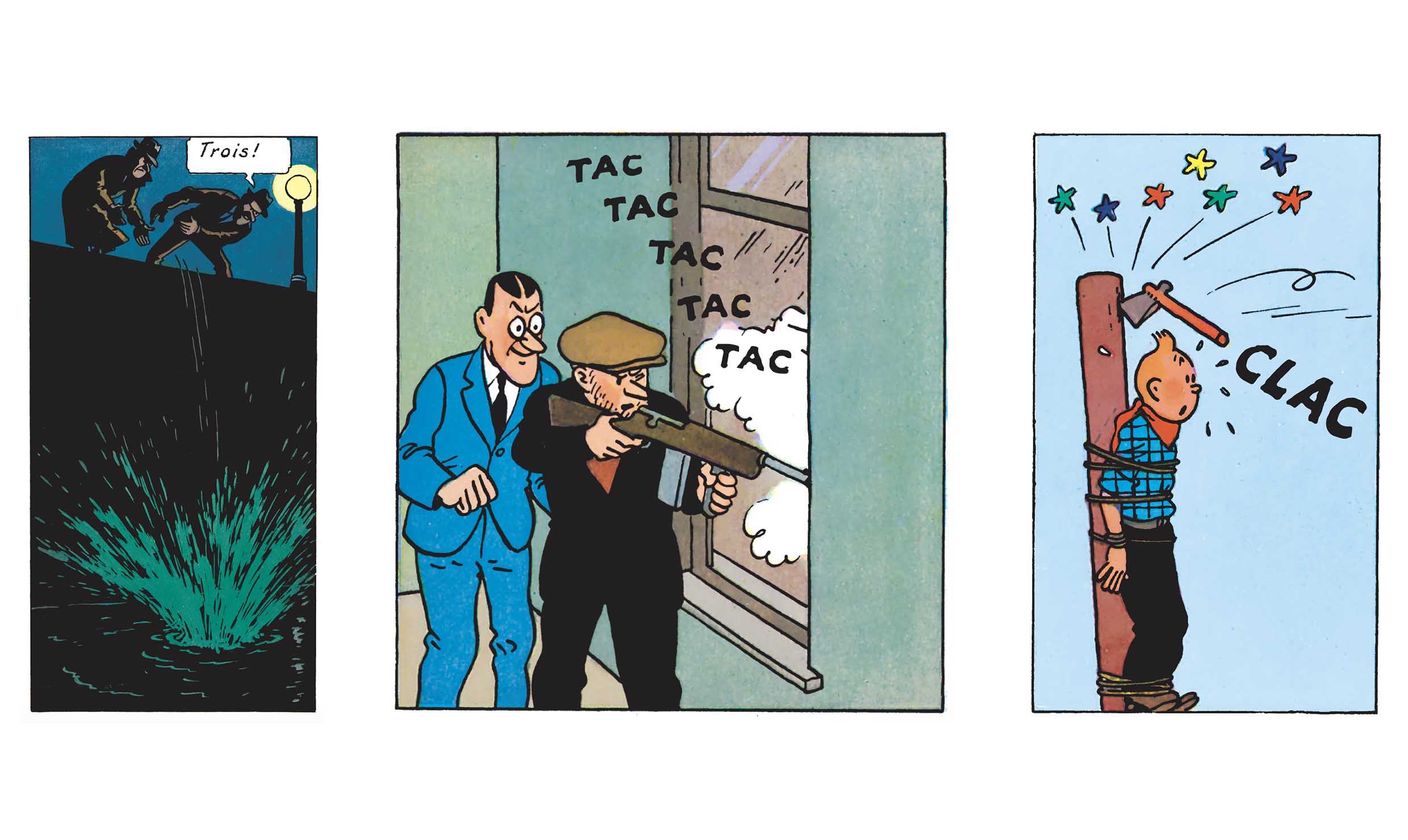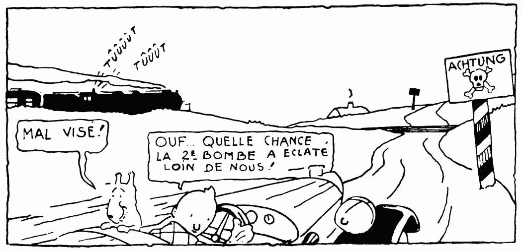 Enfin, il convient de noter que les pièges mortels auxquels Tintin doit sans cesse se soustraire ne sont, en réalité, que des allusions visuelles. Des suggestions graphiques fonctionnant sur le principe de causalité. Parce qu’il se trouve dans une situation qui est au paroxysme de sa dangerosité, le lecteur imagine alors les conséquences dramatiques qui pourraient potentiellement en résulter. Grâce à cette approche, aucune scène violente ou choquante n’apparaît dans les cases.