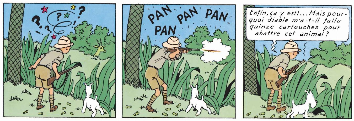Finalement, chez Hergé, la mort est plus souvent une intention hostile qu’une véritable fin en soi. En revanche, quand elle fait son oeuvre, elle n’y va pas par quatre chemins. Dans Tintin au Congo, par exemple, la faune sauvage en sait quelque chose puisqu’elle en fait les frais, aussi bien en genres… ou plutôt, en espèces qu’en nombre. Parmi les victimes : un troupeau de gazelles, un singe, un serpent, un groupe de crocodiles, un éléphant et un rhinocéros. De manière générale, le règne animal est celui qui paye le plus lourd tribut, dans les aventures du jeune héros. Citons d’ailleurs, à titre d’exemple, la mise à mort – et en boîte – du bœuf dans Tintin en Amérique ou encore, le safari improvisé du Temple du Soleil avec les exécutions – contraintes et forcées – d’un condor, d’un boa constrictor et de plusieurs alligators.