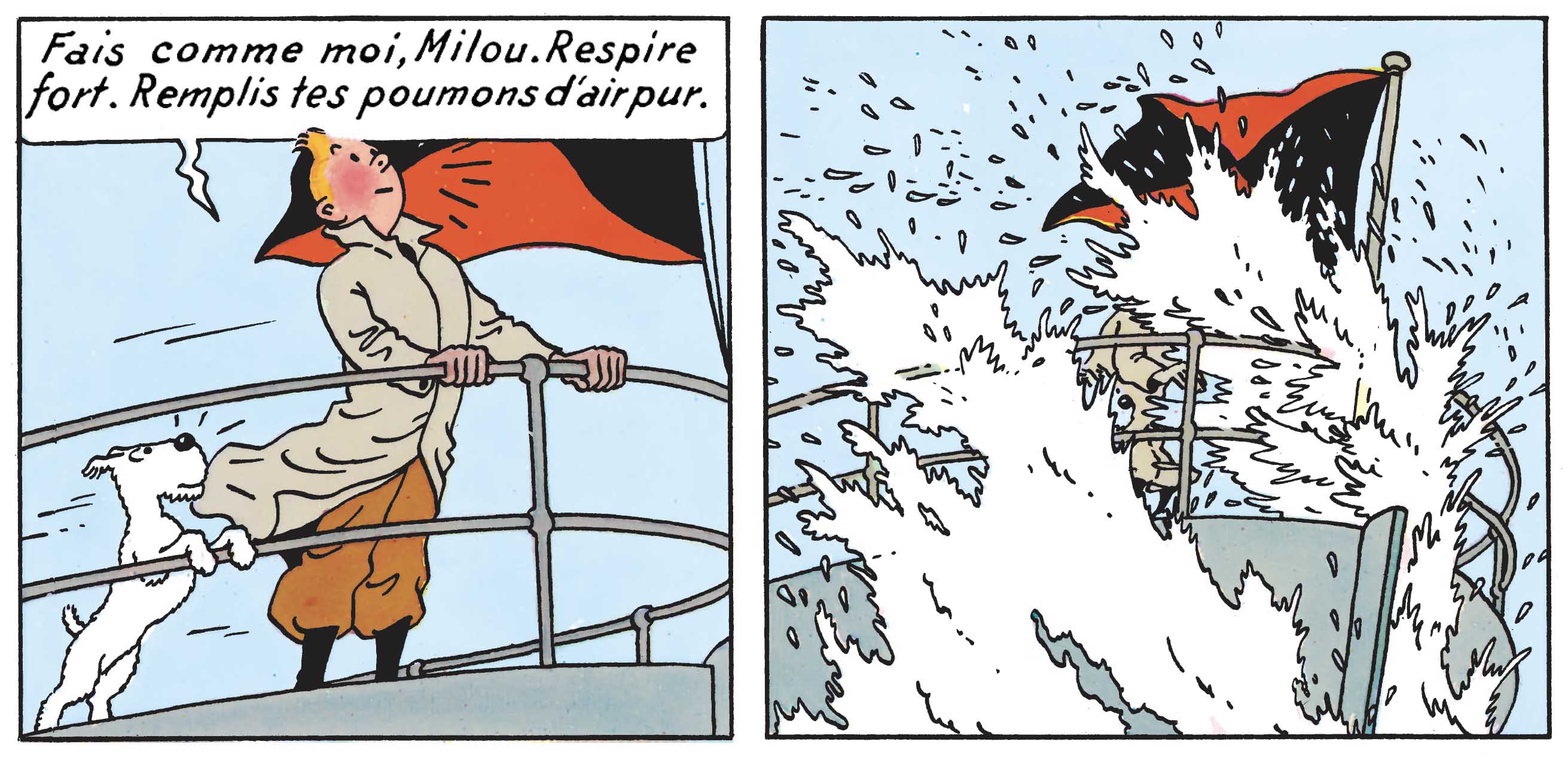 Chez Hergé toutefois, la magie romantique tourne vite au comique : à peine Tintin invite-t-il Milou à respirer « l’air pur » qu’une vague les submerge, balayant l’élan lyrique du moment au profit d’un gag mémorable.
