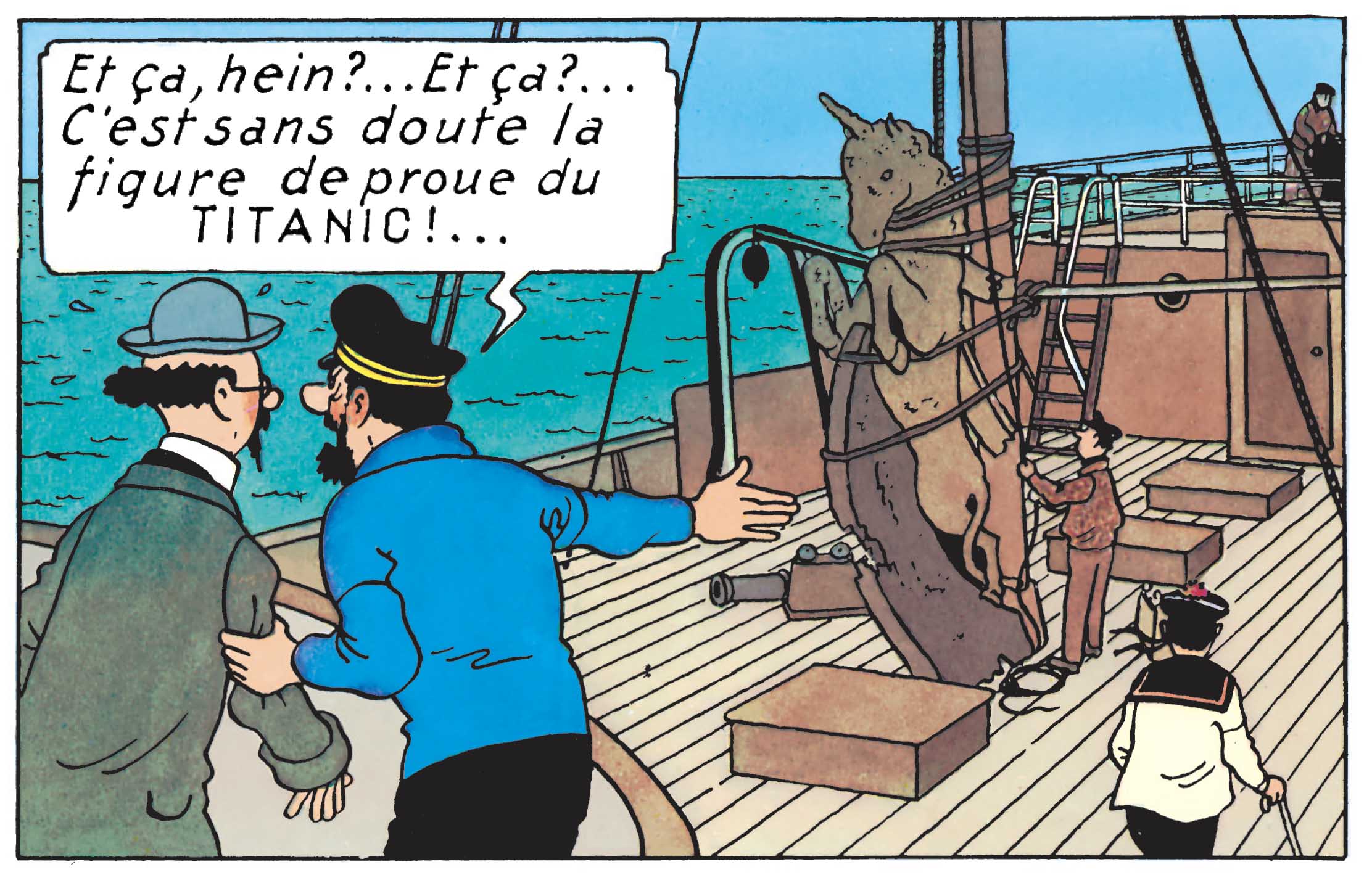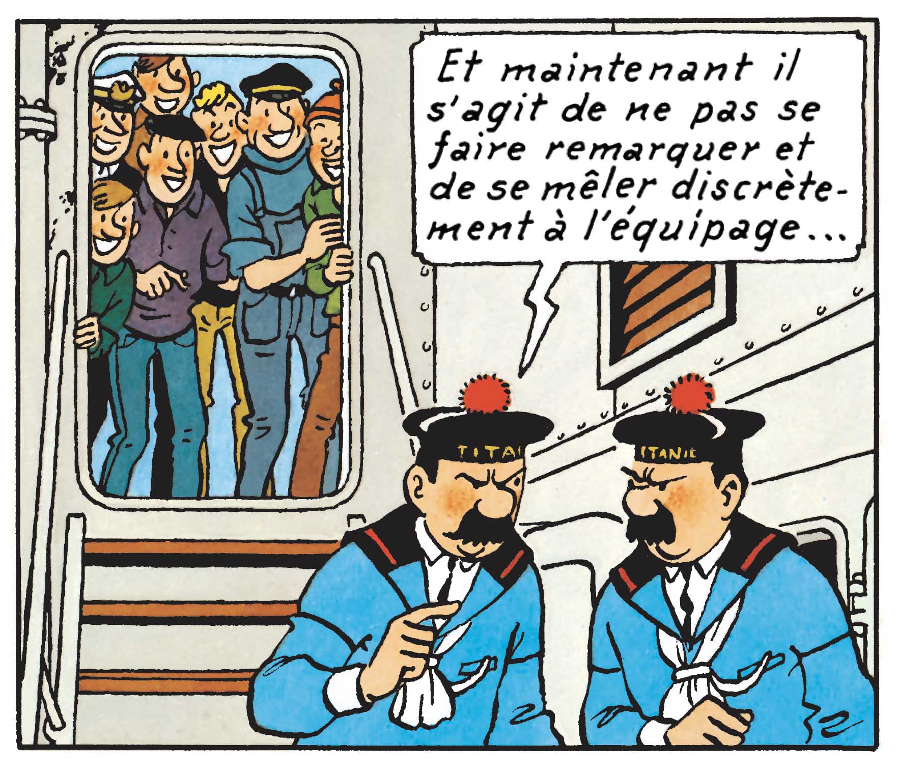 Car le code vestimentaire en vigueur, à bord, relève en fait plus de la marine marchande (salopettes et pulls à col roulé) que de la tenue traditionnelle de matelot. Et c’est même, pour eux, le pompon de la pomponnette – autrement dit, le comble du comble – puisqu’Hergé les affuble de bachis, floqués du nom « Titanic ». Un clin d’œil visuel, discret, mais d’une efficacité redoutable.
