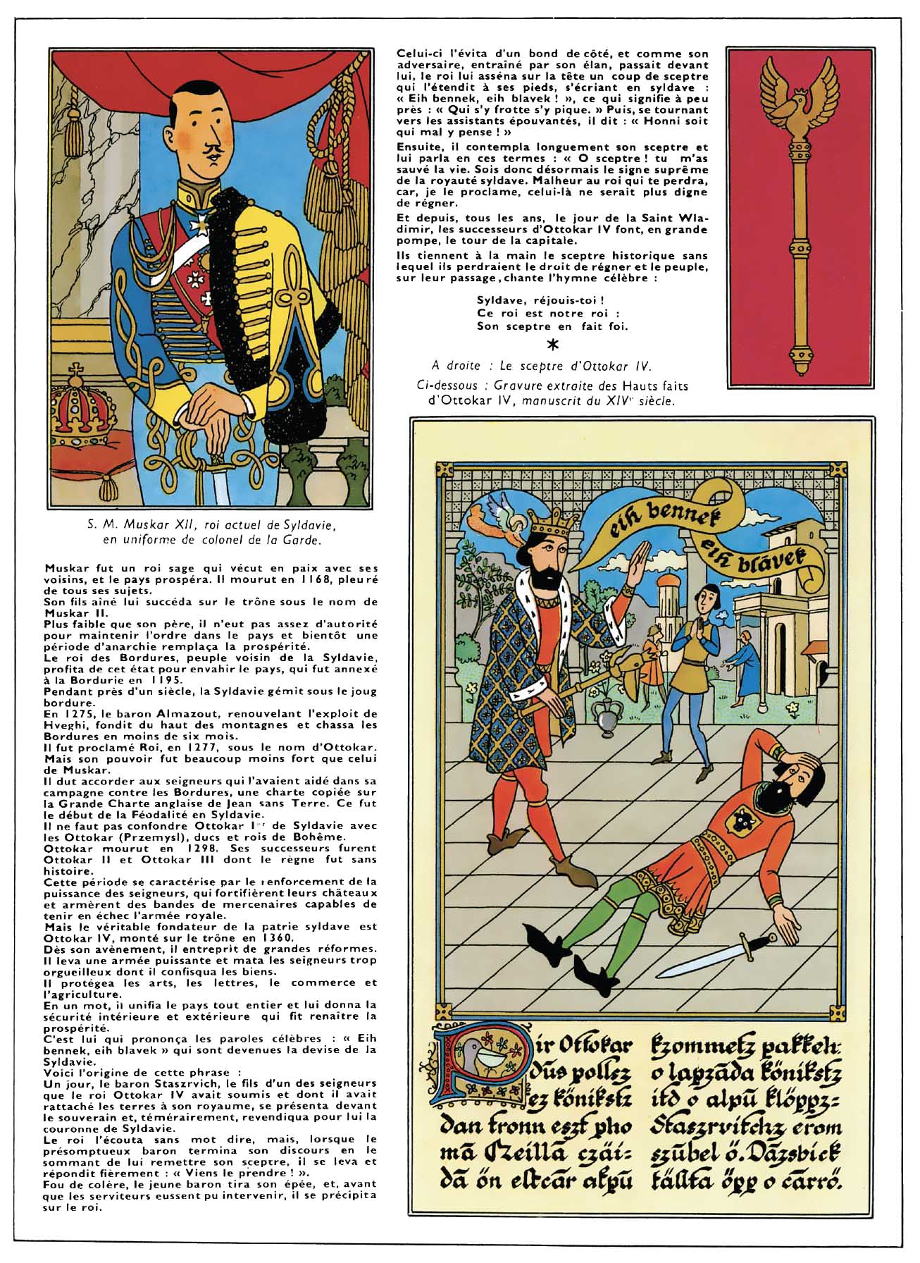 Catastrophe ! Les célèbres détectives Dupond et Dupont mènent aussi l’enquête, mais cela n’empêche pas Tintin de cogiter et peut-être se souvient-il dans l’avion qui l’emmenait à bon port, de la brochure avec l'enluminure de la bataille de Zileheroum et l’avertissement pour le sceptre « Malheur au roi qui te perdra… ». Une bien fameuse histoire ce royaume de Syldavie. Mais un instant… des joyaux royaux, ça se vole ?