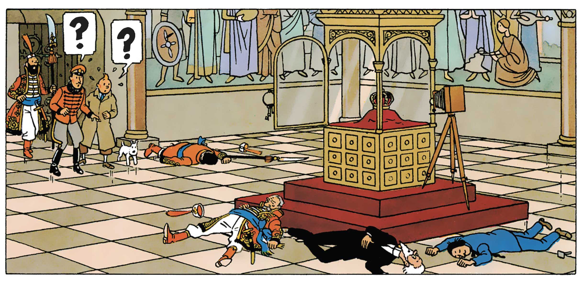 En apparence, l’affaire ressemble à une énigme de chambre close. Une salle gardée de la Tour carrée, des fenêtres grillagées, des hommes en faction, aucun signe d’effraction. Pourtant, le sceptre s’est volatilisé. À Kropow, on s’étrangle, les services du roi s’affolent et les coupables volatilisés. Il ne s’agit pourtant pas ici d’une invention farfelue de Tournesol qui a mal tourné, il n’existe pas encore dans le récit. Tintin, lui, ne lâche pas le fil. L’affaire dépasse la simple curiosité d’un vol bien ficelé : sans sceptre, le roi Muskar XII perd tout droit au trône. En trois jours, la Syldavie peut basculer.