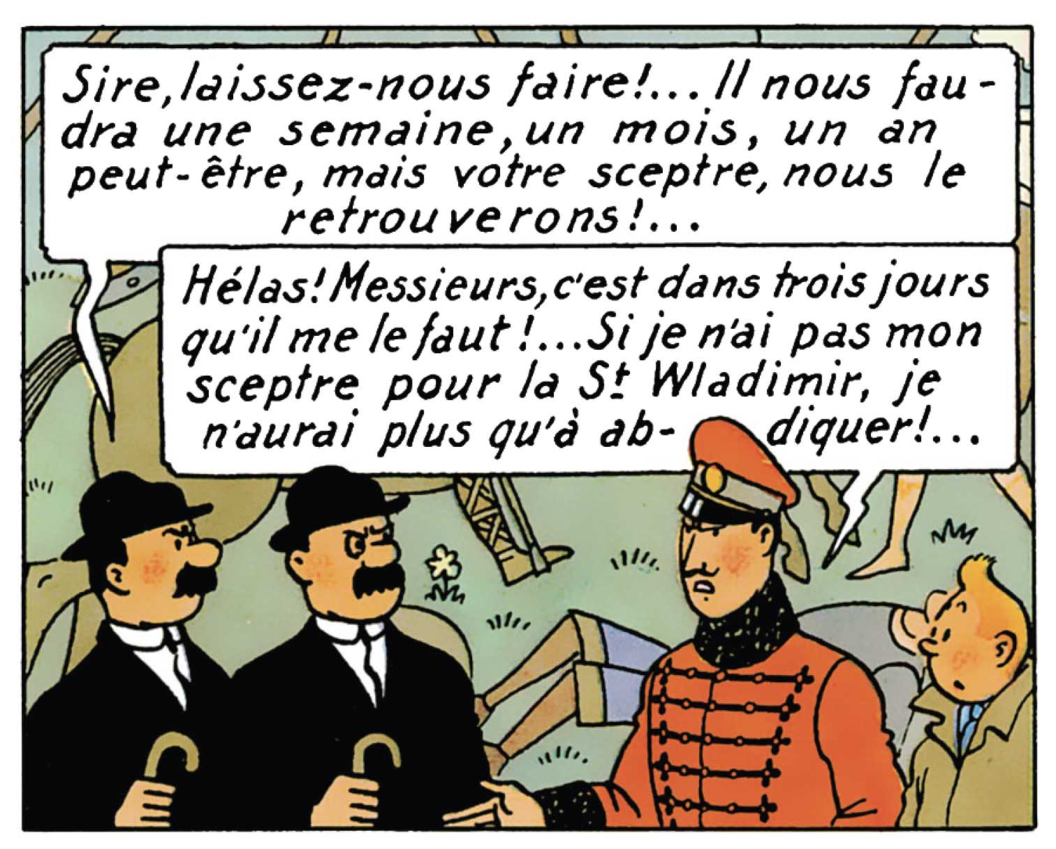 Une filature, un saut d’avion sans possibilité d’ouvrir le parachute, une embuscade, un accident de voiture et… bien des ennuis pour arriver, en bout de course, à la grande salle de Kropow. Celle-ci contient le sceptre royal et tout l’avenir d’un royaume suspendu à un objet d’apparat. Trois jours pour éviter la chute d’un trône, le compte à rebours est lancé. Vite, Tintin, vite !