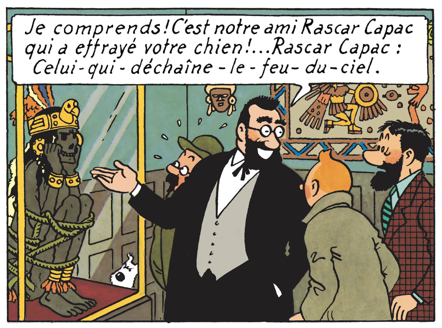 Le professeur Bergamotte y présente à Tintin, au capitaine Haddock et à Tournesol la momie de Rascar Capac, exposée dans une vitrine au milieu de son salon. Une scène tranquille en apparence, où pourtant le vertige du fantastique s’invite déjà dans cette bulle qui annonce le récit… à grand coup de mythologie !