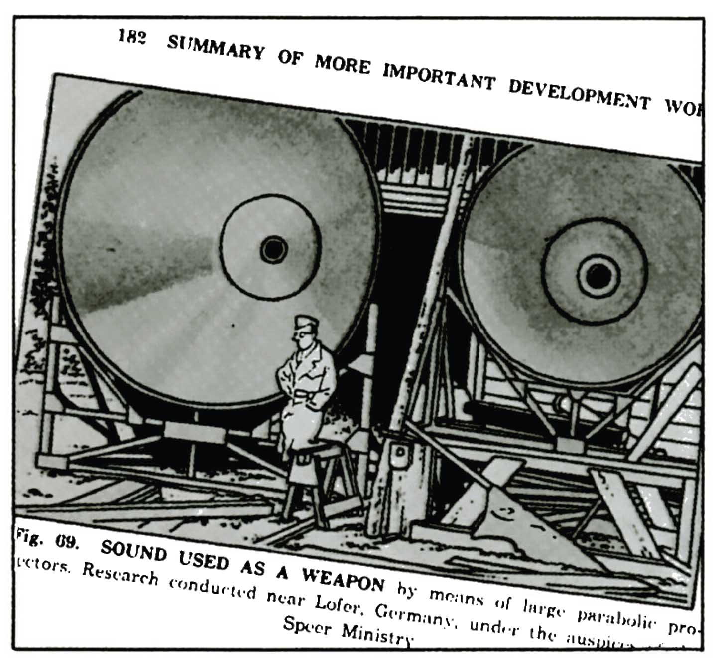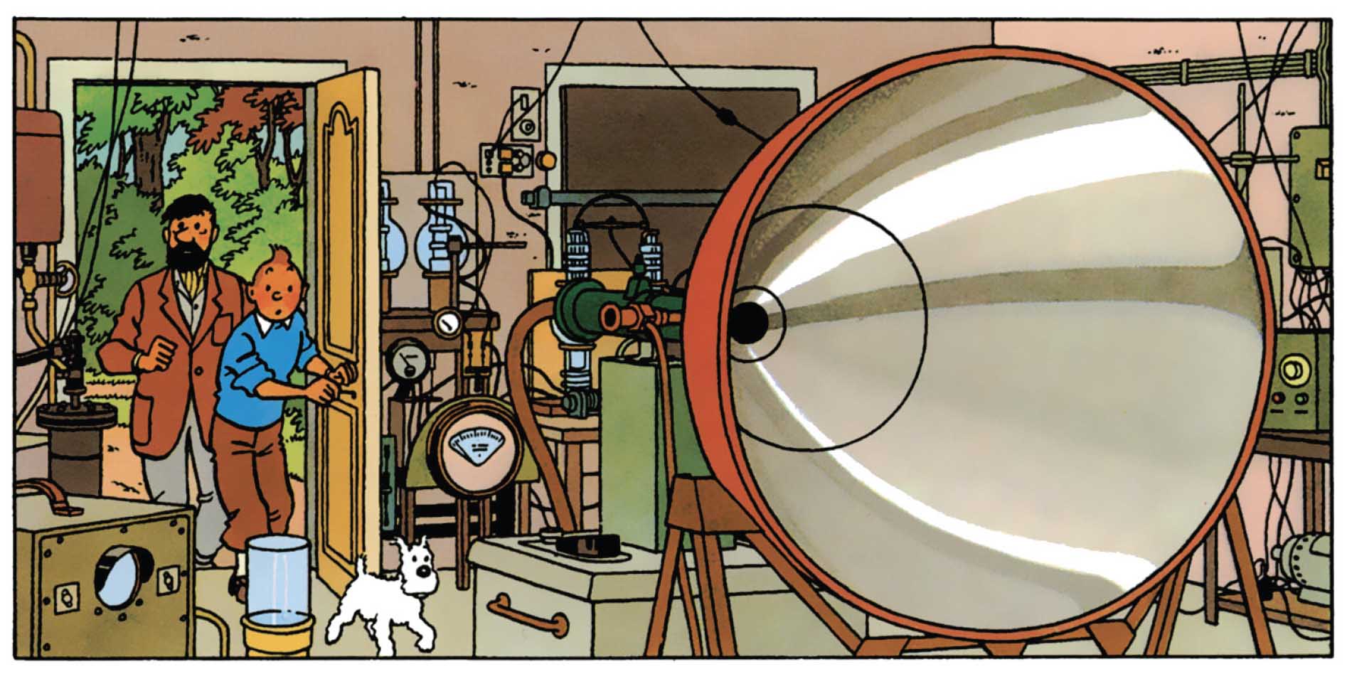 Pour donner corps à cette idée, Hergé se documente avec un soin presque maniaque. Dans ses carnets apparaissent les photographies de pavillons paraboliques construits en Allemagne pendant la guerre, utilisés pour concentrer le son en faisceaux meurtriers. On y lit le nom d’un ingénieur américain, le lieutenant-colonel Leslie Earl Simon, auteur d’un ouvrage technique sur les recherches acoustiques menées sous le ministère Speer. Hergé emprunte à ces images la forme de l’instrument que Tournesol brandit fièrement avant d’en devenir prisonnier. Ce n’est plus une fantaisie d’artiste : c’est une hypothèse plausible, une invention que la réalité pourrait presque revendiquer.