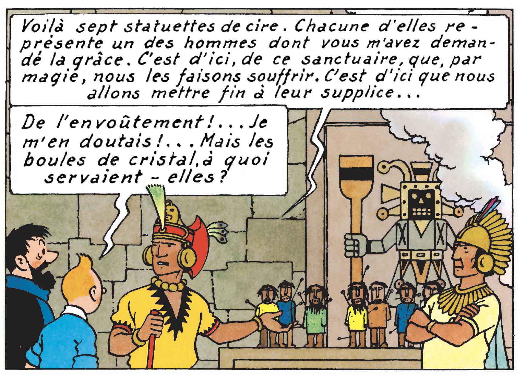 Rejouons la scène un instant : l’Inca apparaît peu, mais la nuit et l’orage comme climat de menace enveloppent tout l’environnement. Autour de ce prémice crispant, des objets jalonnent les pages (les boules de cristal ou encore le bracelet récupéré par Tournesol) et tissent la toile du mystère.