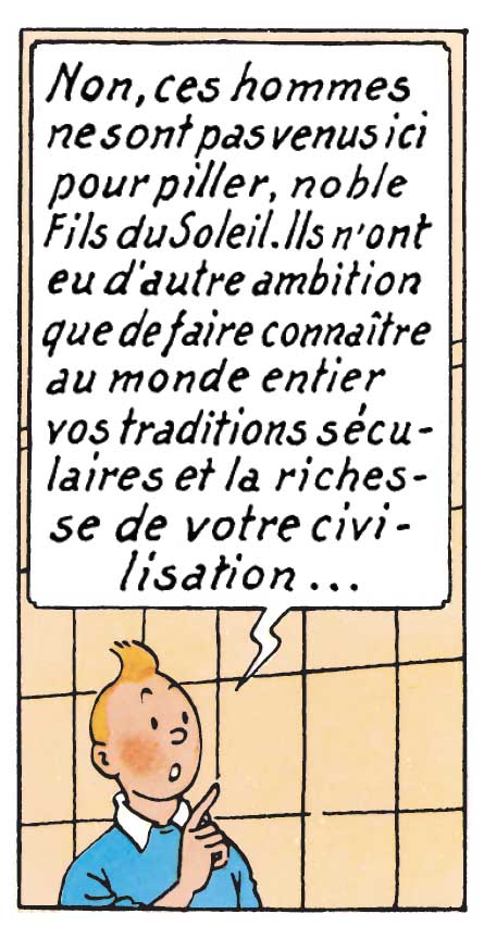 Nous en avions brièvement parlé au début de l’article, l’album met en scène une critique explicite de la spoliation (le voyageur du train interroge : « que dirions‑nous si… ? ») tout en donnant corps à une peur venue d’ailleurs (la « maladie » mystérieuse, l’Inca menaçant en Europe). Hergé apparaît ainsi ambivalent : il suggère la légitimité d’une vengeance contre les pillages, tout en représentant cette altérité comme dangereuse pour les Européens. Plus loin dans le diptyque (cf. Le Temple du Soleil), Tintin défend l’idée que les savants voulaient faire connaître « la splendeur » d’une civilisation, une position qui met à l’honneur toute la nuance d’Hergé dans son œuvre.