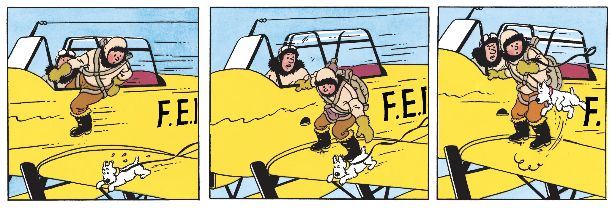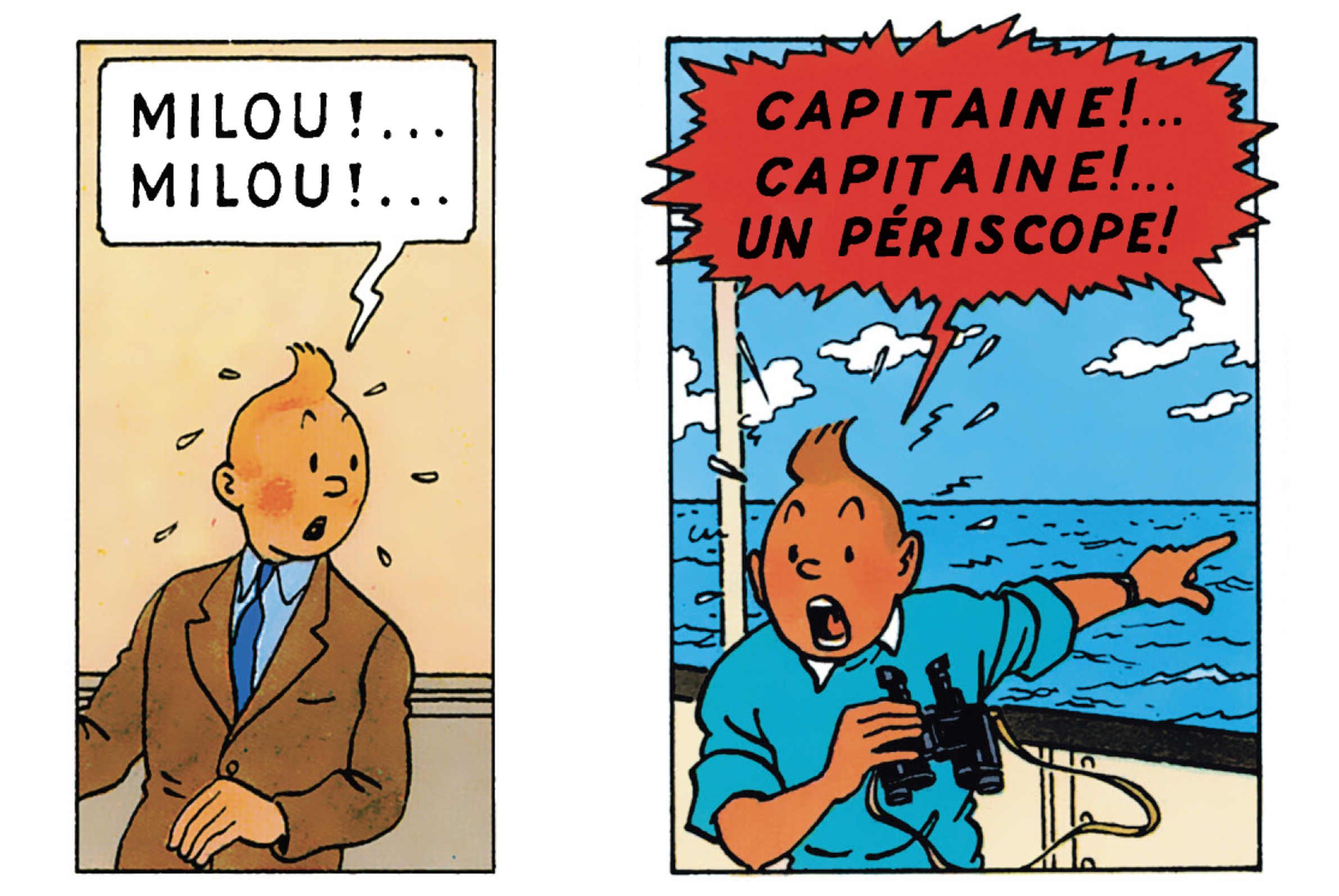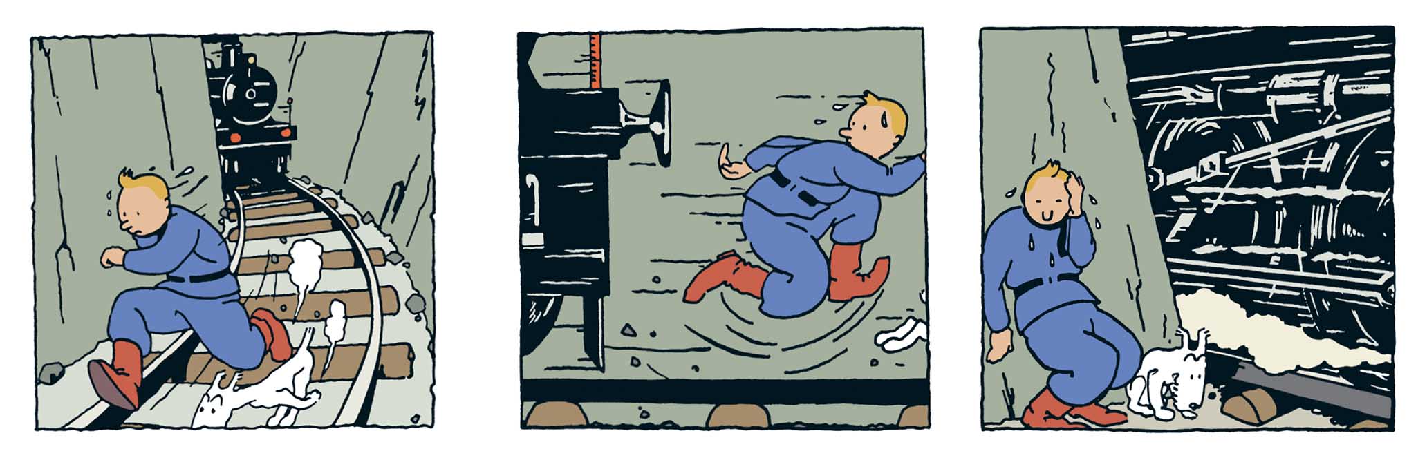 Cette retenue donne à Tintin une expressivité singulière. La surprise se lit dans l’ouverture des yeux et le léger basculement du buste ; la peur, dans un pas de côté et une crispation du bras ; la détermination, dans une posture soudain droite, compacte, prête à agir. Même l’immobilité devient éloquente : penché sur un indice, accroupi dans la poussière, figé devant une découverte.