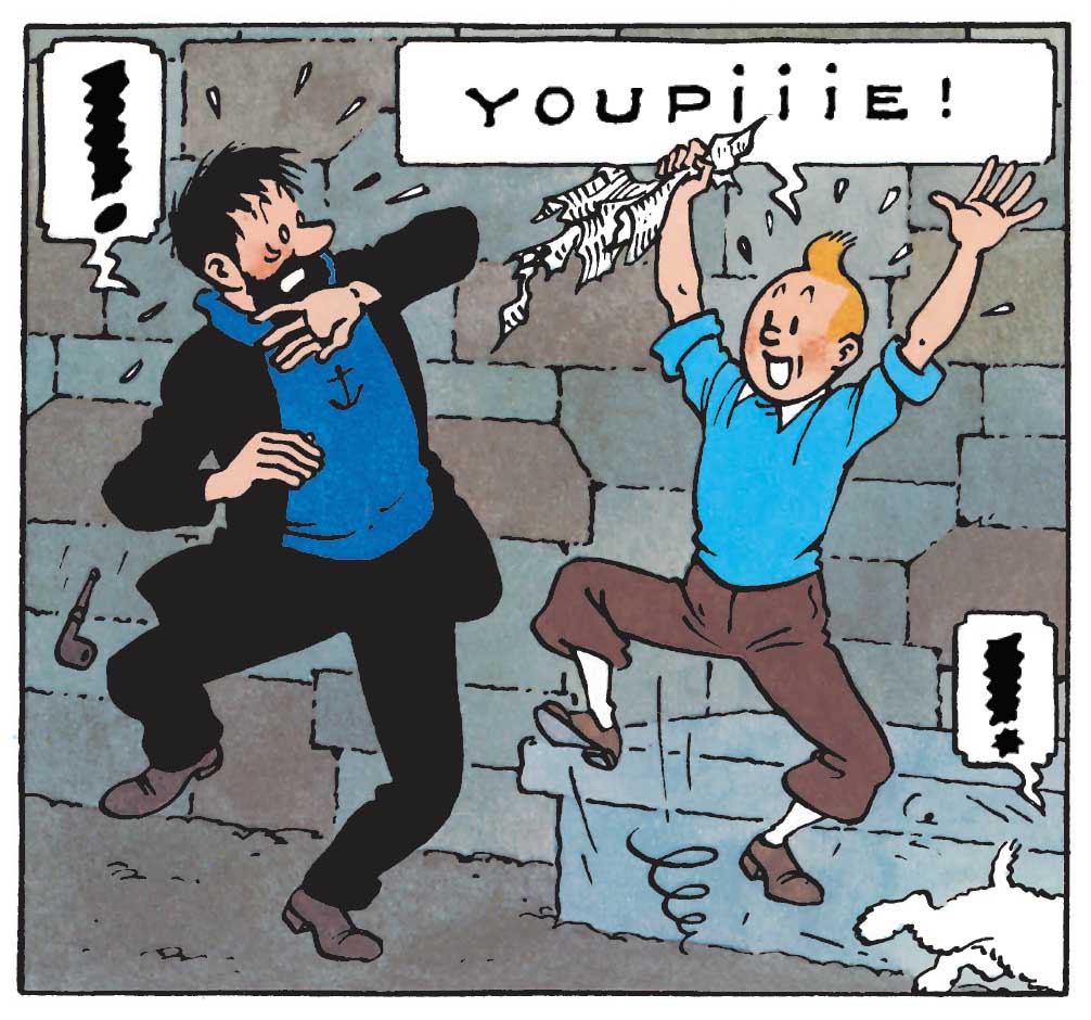 Chez Tintin, le geste précède souvent la parole, et parfois même la remplace. À grands coups de roulades, de courses-poursuites endiablées, de rixes et de toutes sortes d’acrobaties, sur terre, sur mer et même dans le ciel, il retombe toujours sur ses pieds et repart de plus belle vers sa prochaine aventure.