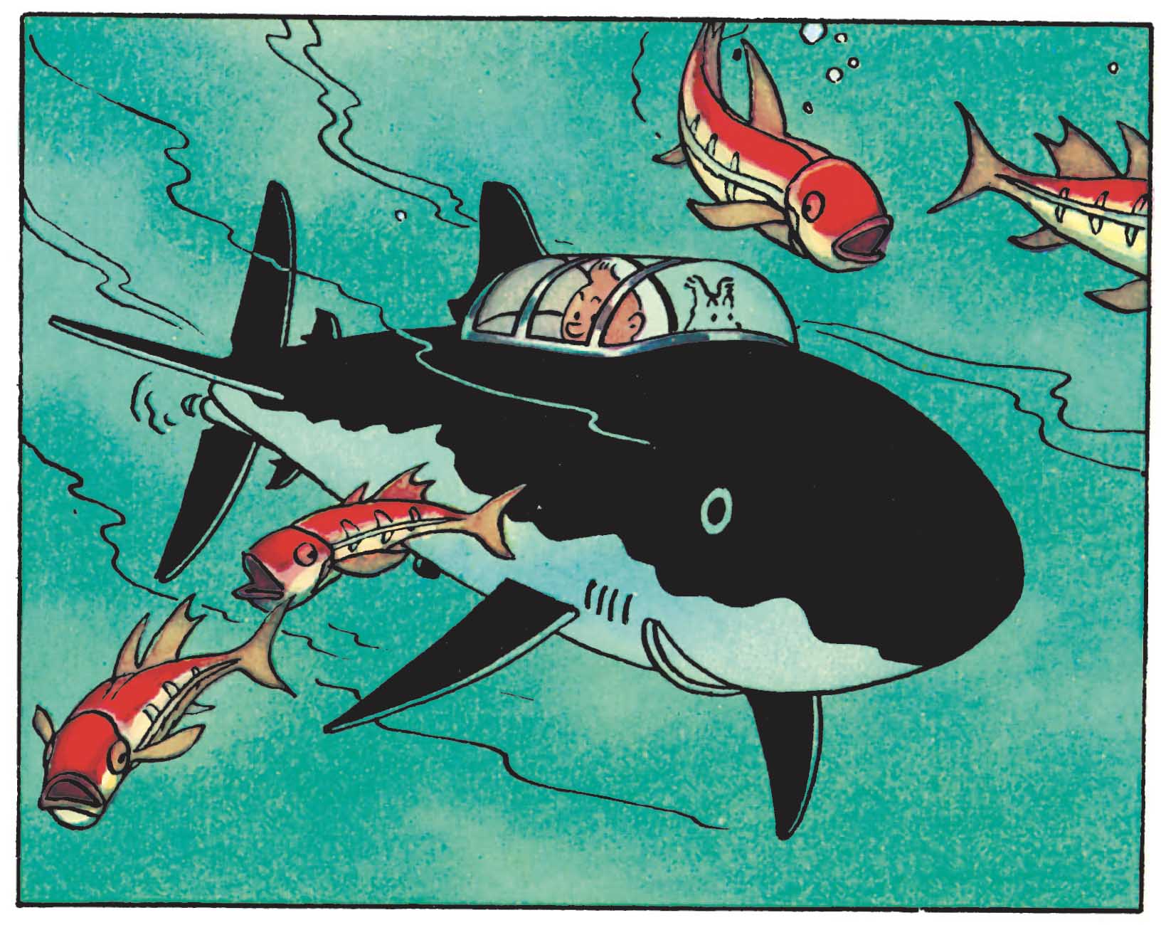 Certaines images se sont imposées durablement. Tintin suspendu dans le vide, cramponné à une paroi glacée dans Tintin au Tibet ; face au terrible mais pourtant attendrissant Ranko dans l’Ile Noire ; menacé par des explosions ou des armes invisibles dans L’Affaire Tournesol ; ou encore englouti sous l’eau, entouré de requins, dans Le Trésor de Rackham le Rouge.