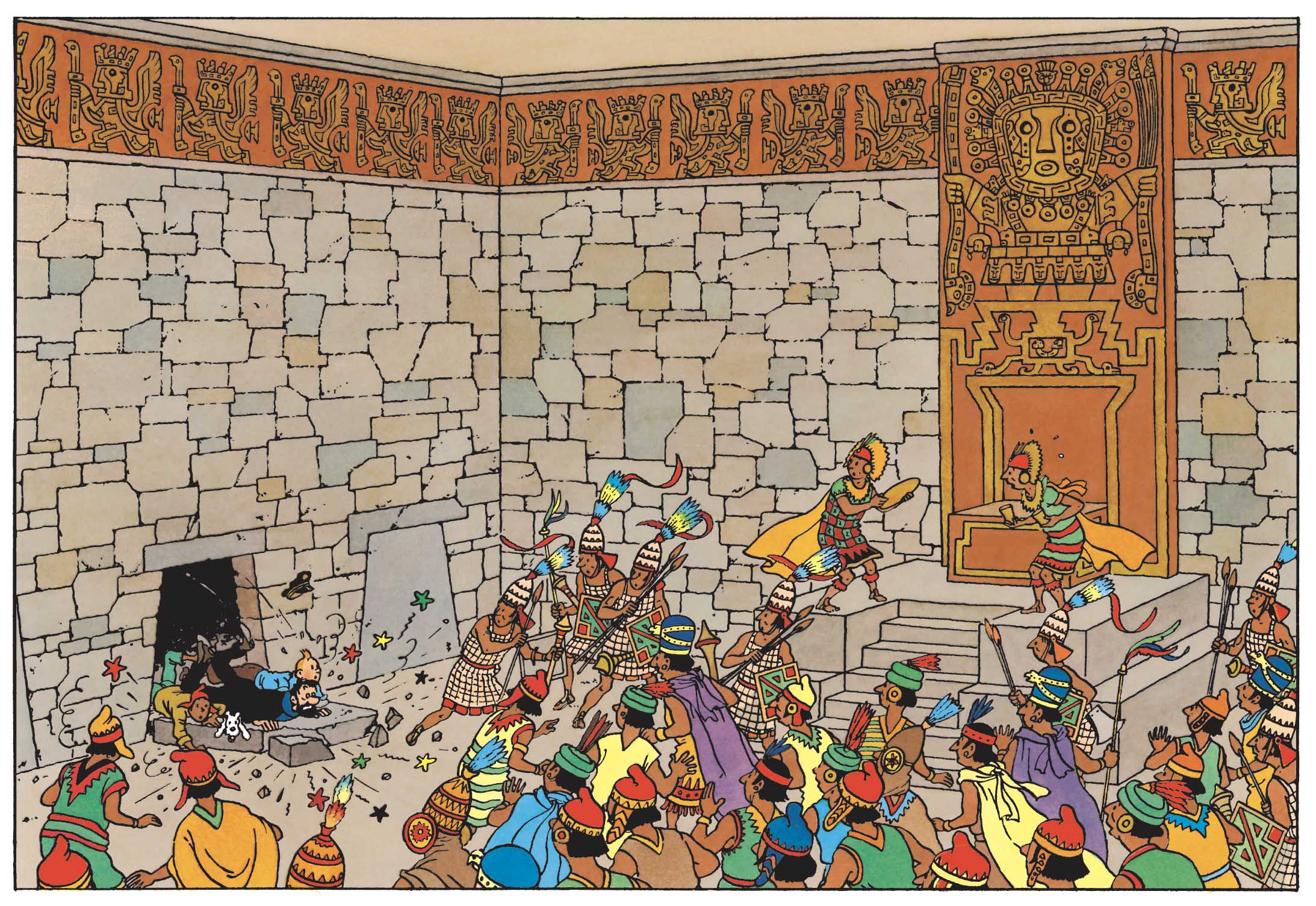 Hergé conçoit ces espaces comme de véritables terrains d’épreuve. La montagne isole, la mer expose, la ville enferme, le désert épuise. Et toujours, ces lieux reposent sur une documentation rigoureuse (photographies, récits de voyage, croquis) avant d’être réinterprétés pour devenir immédiatement reconnaissables. Et en retirant Tintin, c’est toute une géographie imaginaire qui s’effondrerait. Comment ne pas s’émerveiller, par exemple, devant le travail de reconstitution du Temple du Soleil ? Ces images d’Épinal, devenues évidentes à force d’être vues, on les doit aussi à Tintin.