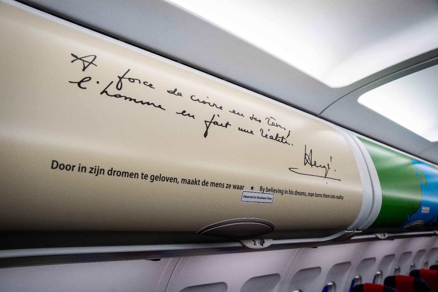 À l'intérieur de la cabine, l'expérience Belgian Icon se poursuit, où l'atmosphère lunaire est prolongée à travers divers éléments de design. Les compartiments supérieurs racontent une histoire avec une séquence d'images qui se succèdent comme des cases de bande dessinée : la fusée décollant de la Terre, le risque de rencontrer un astéroïde... Le tout encadré par une citation manuscrite d'Hergé : « A force de croire en ses rêves, l’Homme en fait une réalité* ».