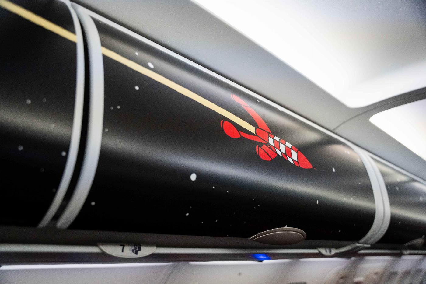 Les passagers retrouveront également Milou et Tintin, ainsi que Dupond et Dupont sur les cloisons, tandis que la moquette imprimée numériquement par Lantal Textiles fait subtilement référence à l'espace.