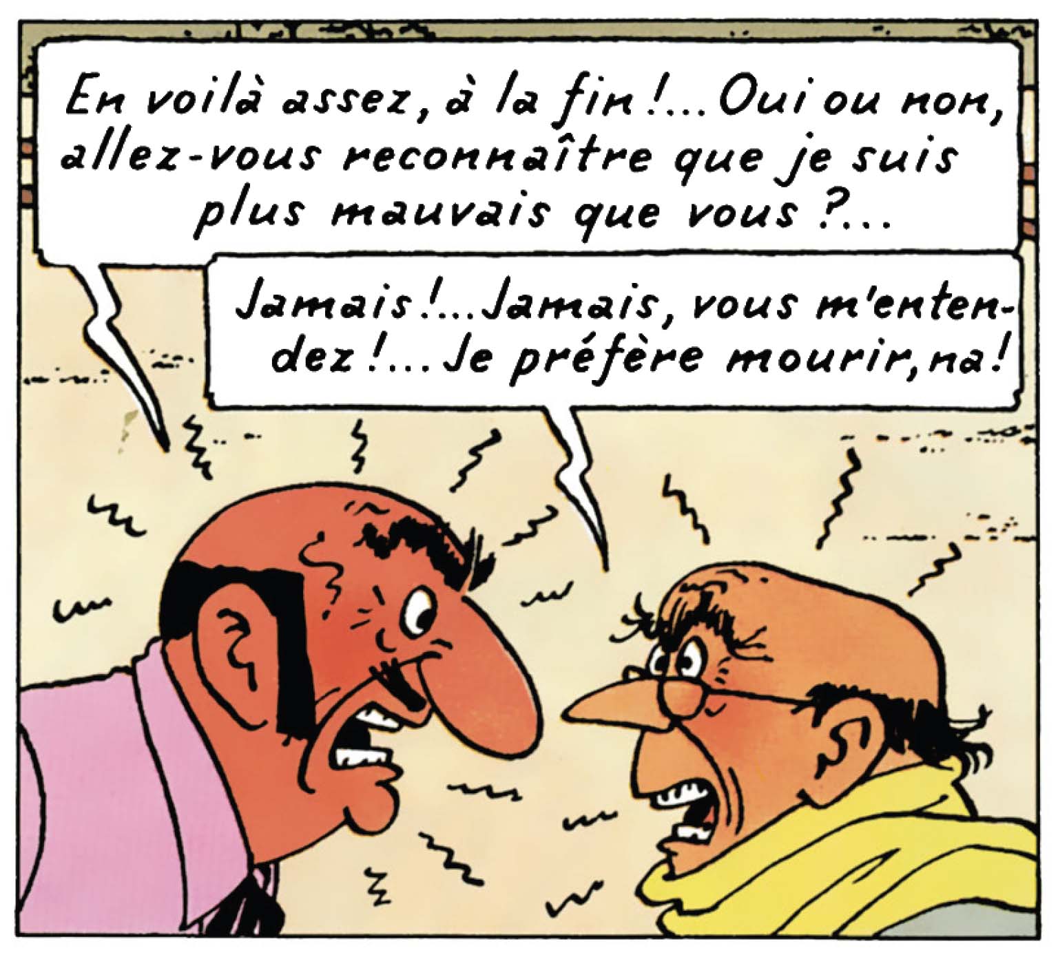 Mais c’est surtout une fois capturé que le milliardaire révèle toute sa singularité. Sous l’effet du sérum de vérité, il se lance dans une étrange compétition avec Rastapopoulos pour savoir lequel des deux est le pire. Vol de poire dans l’enfance, tricheries, coups bas : Carreidas déballe tout, avec un sérieux presque déroutant, voire grotesque !