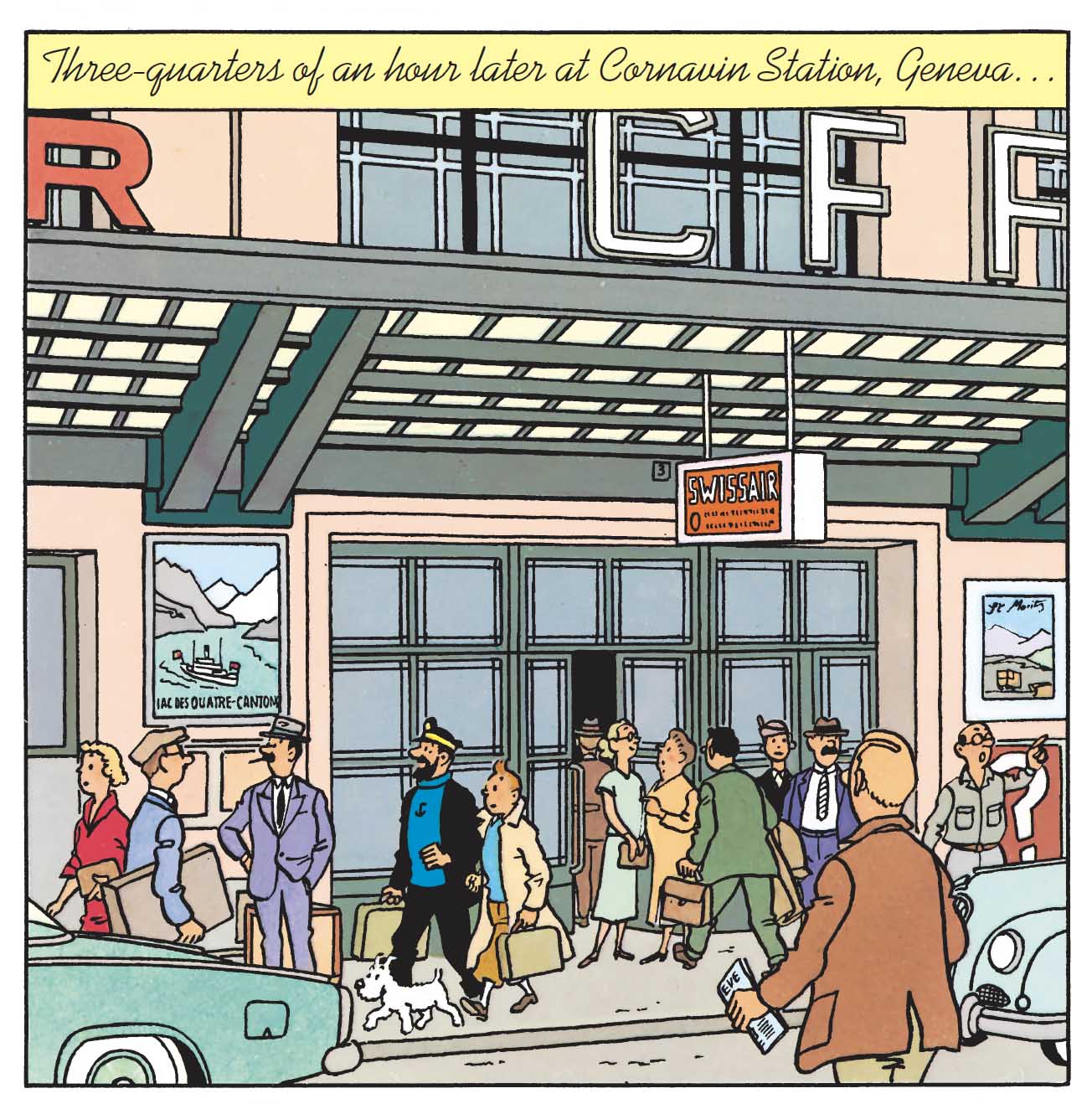 Around him, the Studios Hergé operate with method and rigor. The Cornavin train station, featured in the album, is depicted with striking accuracy. Hergé himself takes photographs, studies the volumes, refines the angles. The buildings are reconstructed down to the smallest detail. A new dynamic is now in place: Hergé is no longer alone at his table, he’s out in the field, and his collaborators ensure visual continuity back at the studio.